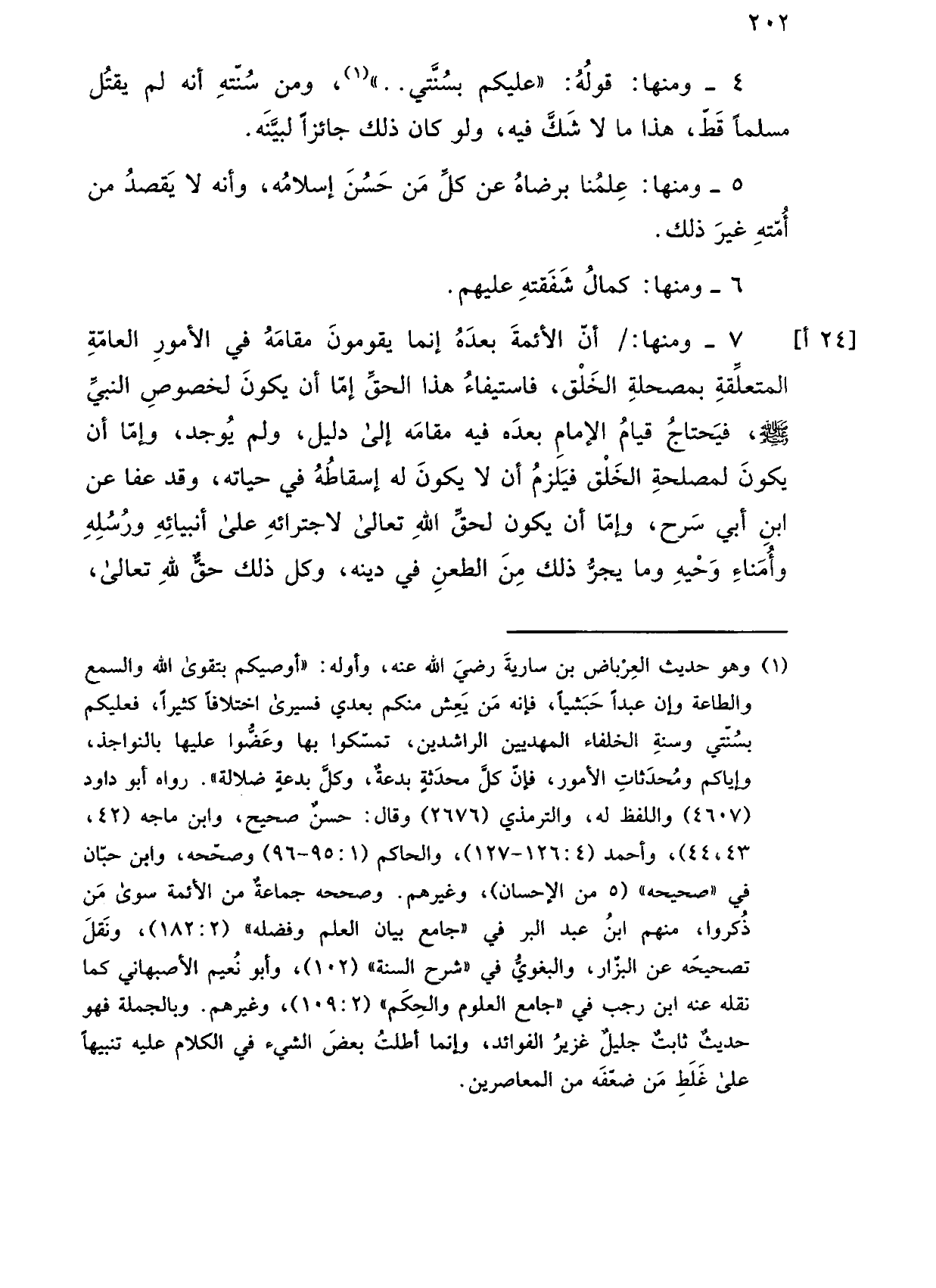 4 - ومنها: قوله: "عليكم بسنتي .. "، ومن سننه أنه لم يقتل مسلمًا قط، هذا ما لا شك فيه، ولو كان ذلك جائزًا لبينه.
