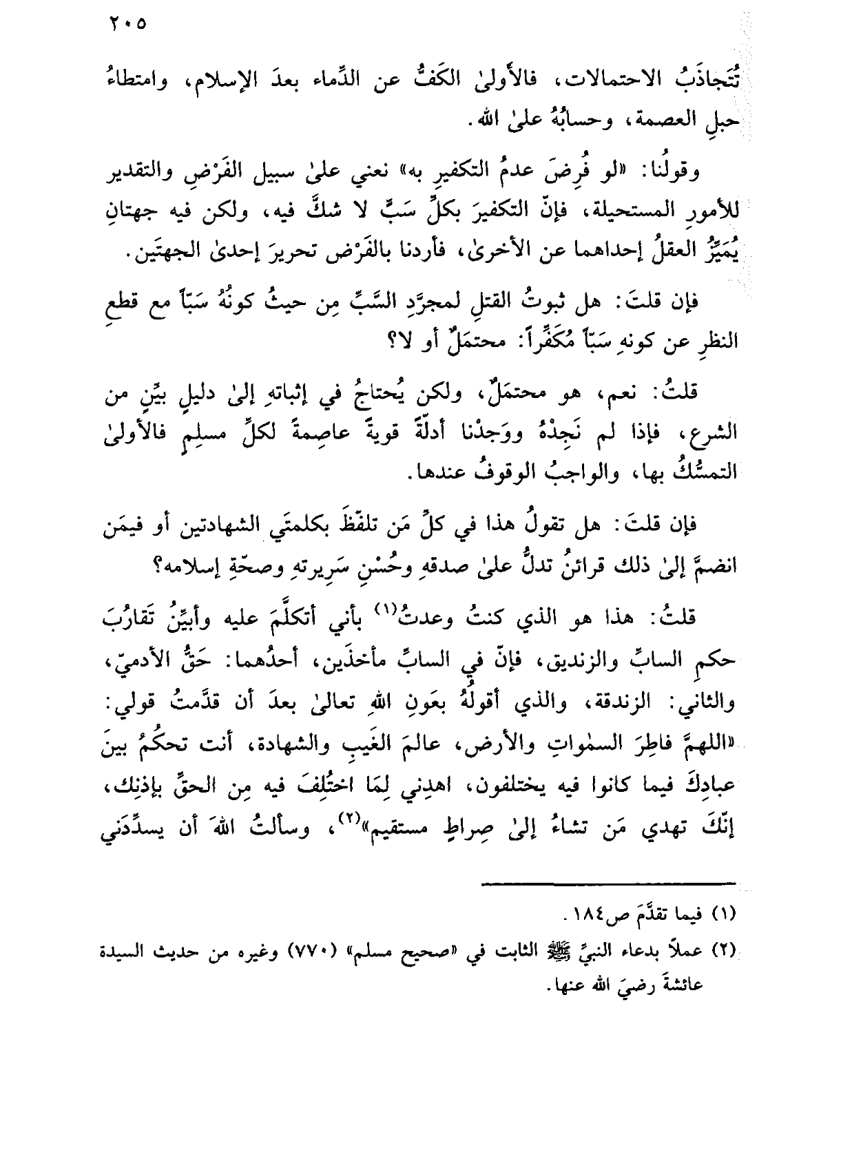 وقولنا: "لو فرض عدم التكفير به" نعني على سبيل الفرض والتقدير للأمور المستحيلة، فإن التكفير بكل سب لا شك فيه، ولكن فيه جهتان يميز العقل إحداهما عن الأخرى، فأردنا بالفرض تحرير إحدى الجهتين.