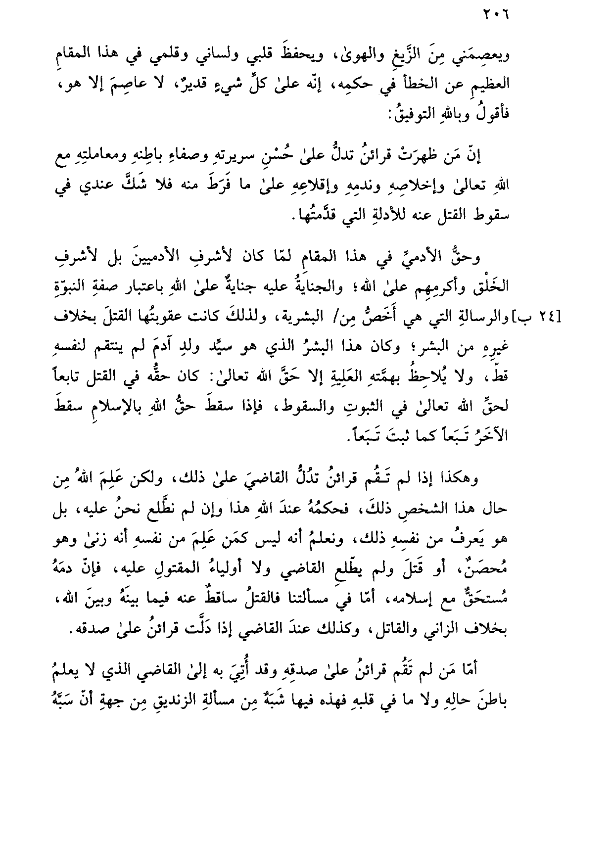 إن من ظهرت قرائن تدل على حسن سريرته وصفاء باطنه ومعاملته مع الله تعالى وإخلاصه وندمه وإقلاعه على ما فرط منه فلا شك عندي في سقوط القتل عنه للأدلة التي قدمتها.