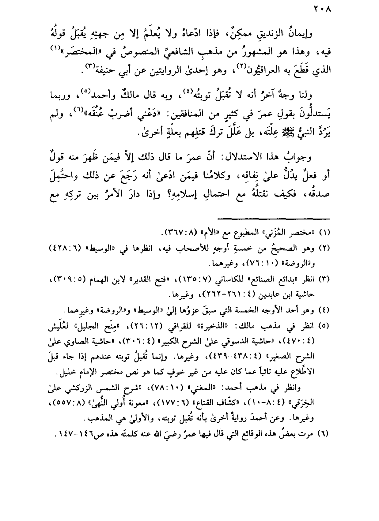وجواب هذا الاستدلال: أن عمر ما قال ذلك إلا فيمن ظهر منه قول أو فعل يدل على نفاقه، وكلامنا فيمن ادعى أنه رجع عن ذلك واحتمل صدقه، فكيف نقتله مع احتمال إسلامه؟ وإذا دار الأمر بين تركه مع