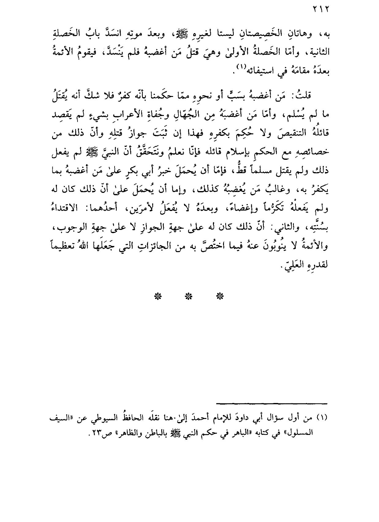 به، وهاتان الخصيصتان ليستا لغيره صلى الله عليه وسلم، وبعد موته انسد باب الخصلة الثانية، وأما الخصلة الأولى وهي قتل من أغضبه فلم ينسد، فيقوم الأئمة بعده مقامه في استيفائه.