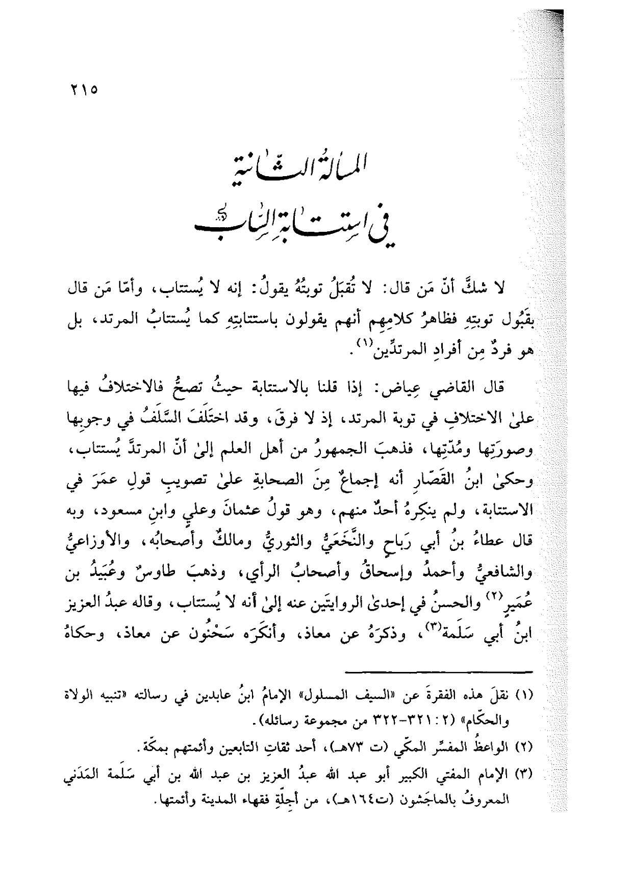 قال القاضي عياض: إذا قلنا بالاستتابة حيث تصح فالاختلاف فيها على الاختلاف في توبة المرتد، إذ لا فرق، وقد اختلف السلف في وجوبها وصورتها ومدتها، فذهب الجمهور من أهل العلم إلى أن المرتد يستتاب، وحكى ابن القصار أنه إجماع من الصحابة على تصويب قول عمر في الاستتابة، ولم ينكره أحد منهم، وهو قول عثمان وعلي وابن مسعود، وبه قال عطاء بن أبي رباح والنخعي والثوري ومالك وأصحابه، والأوزاعي والشافعي وأحمد وإسحاق وأصحاب الرأي، وذهب طاوس وعبيد بن عمير والحسن في إحدى الروايتين عنه إلى أنه لا يستتاب، وقاله عبد العزيز ابن أبي سلمة، وذكره عن معاذ، وأنكره سحنون عن معاذ، وحكاه