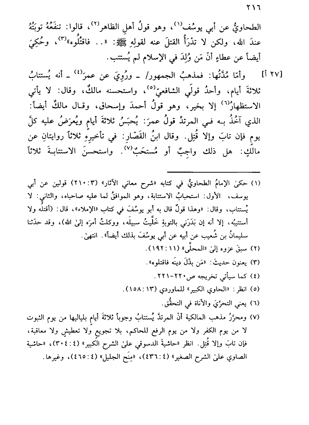 وأما مدتها: فمذهب الجمهور/ ـ وروي عن عمر ـ أنه يستتاب ثلاثة أيام، وأحد قولي الشافعي، واستحسنه مالك، وقال: لا يأتي الاستظهار إلا بخبر، وهو قول أحمد وإسحاق، وقال مالك أيضًا: الذي آخذ به في المرتد قول عمر: يحبس ثلاثة أيام ويعرض عليه كل يوم فإن تاب وإلا قتل. وقال ابن القصار: في تأخيره ثلاثًا روايتان عن مالك: هل ذلك واجب أو مستحب. واستحسن الاستتابة ثلاثًا