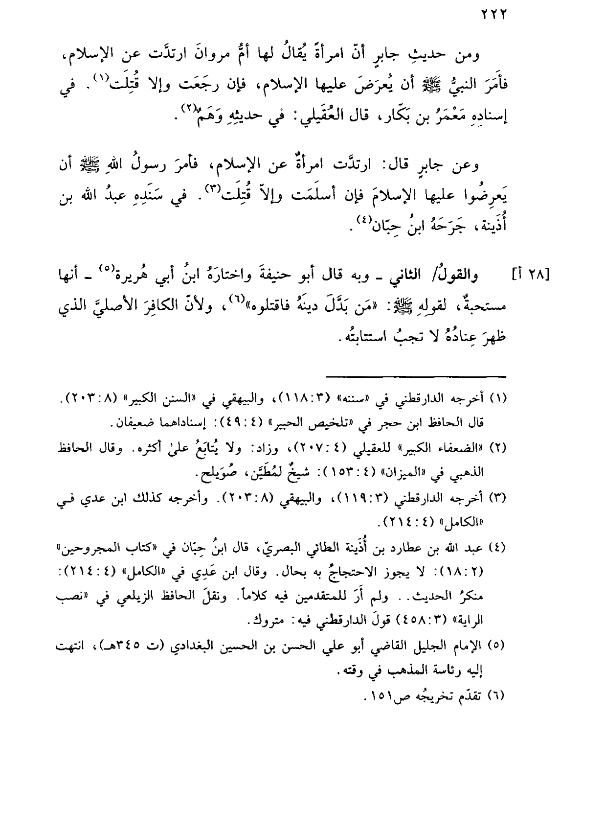 وعن جابر قال: ارتدت امرأة عن الإسلام، فأمر رسول الله صلى الله عليه وسلم أن يعرضوا عليها الإسلام فإن أسلمت وإلا قتلت. في سنده عبد الله بن أذينة، جرحه ابن حبان.