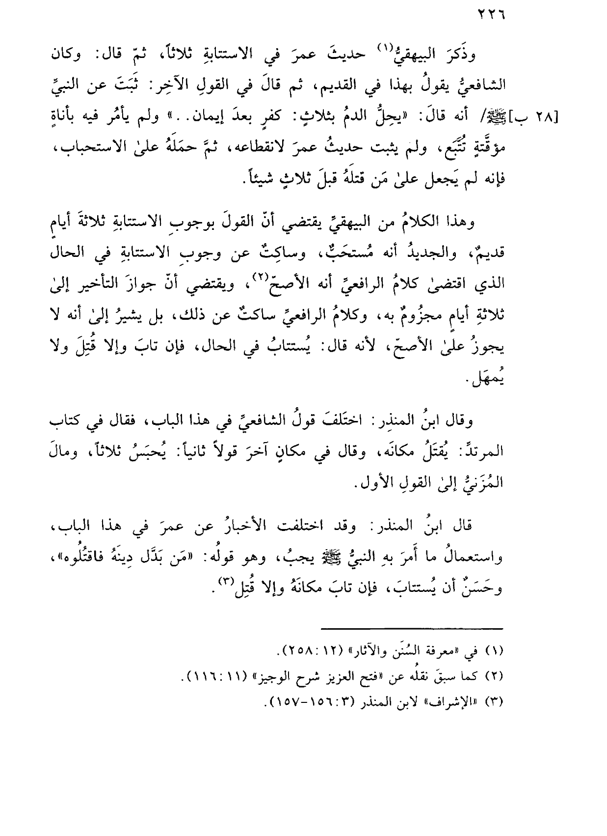 وذكر البيهقي حديث عمر في الاستتابة ثلاثًا، ثم قال: وكان الشافعي يقول بهذا في القديم، ثم قال في القول الآخر: ثبت عن النبي صلى الله عليه وسلم/ أنه قال: "يحل الدم بثلاث: كفر بعد إيمان .. " ولم يأمر فيه بأناةٍ مؤقتة تتبع، ولم يثبت حديث عمر لانقطاعه، ثم حمله على الاستحباب، فإنه لم يجعل على من قتله قبل ثلاث شيئًا.