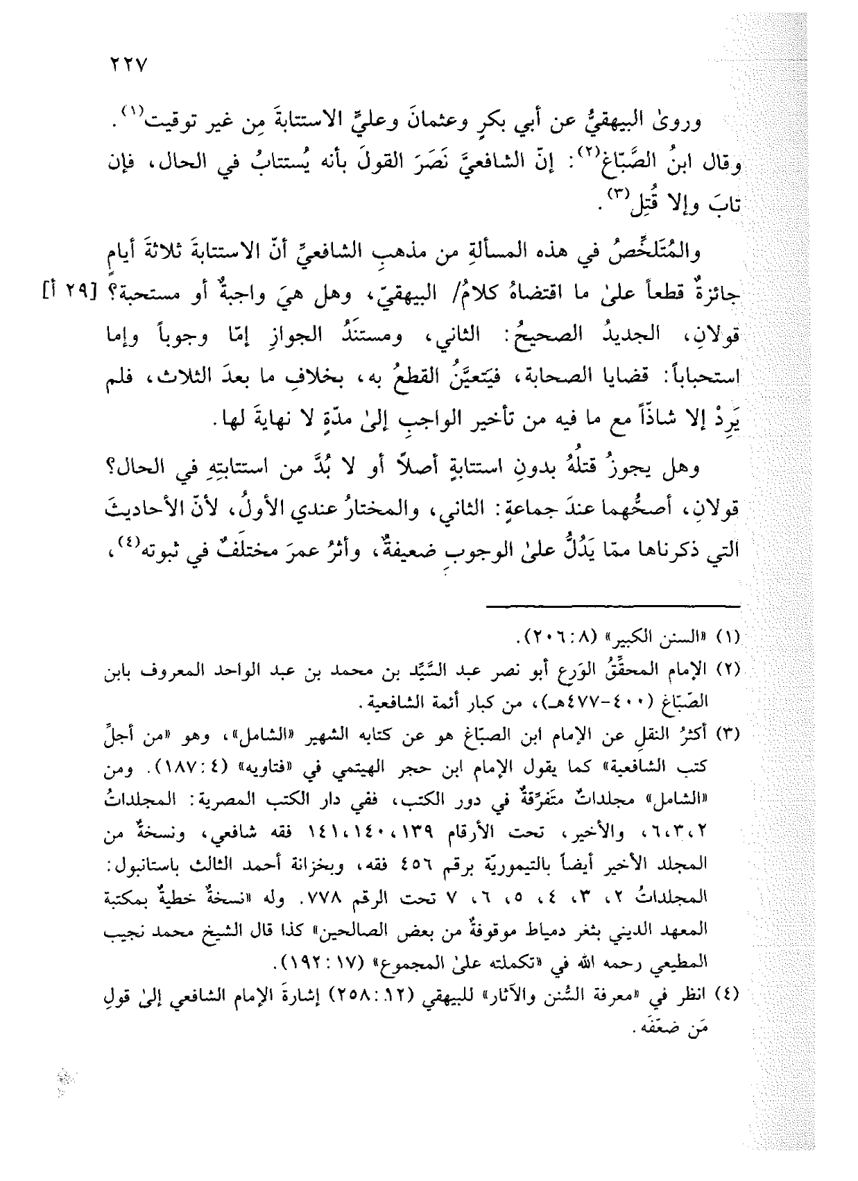 والمتلخص في هذه المسألة من مذهب الشافعي أن الاستتابة ثلاثة أيام جائزة قطعًا على ما اقتضاه كلام/ البيهقي، وهل هي واجبة أو مستحبة؟ قولان، الجديد الصحيح: الثاني، ومستند الجواز إما وجوبًا وإما استحبابًا: قضايا الصحابة، فيتعين القطع به، بخلاف ما بعد الثلاث، فلم يرد إلا شاذًا مع ما فيه من تأخير الواجب إلى مدة لا نهاية لها.