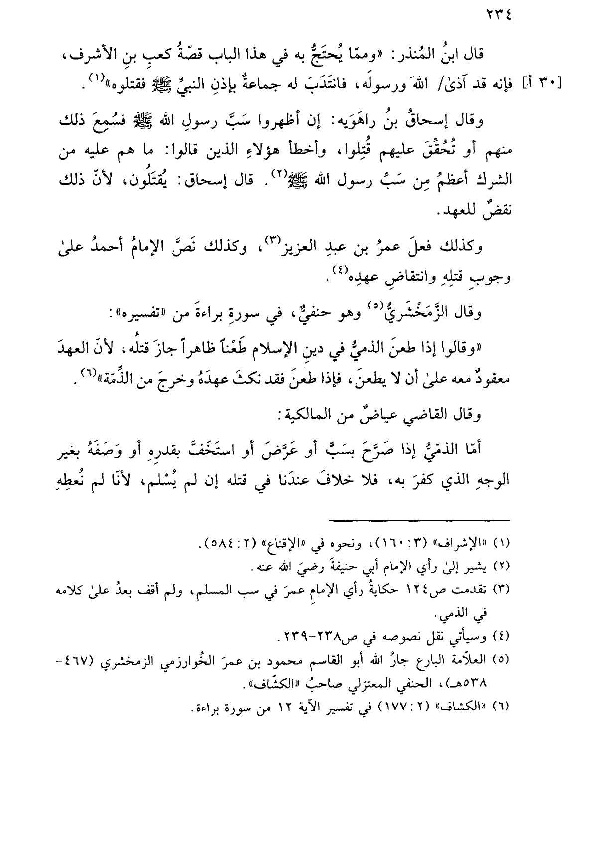 "وقالوا إذا طعن الذمي في دين الإسلام طعنًا ظاهرًا جاز قتله، لأن العهد معقود معه على أن لا يطعن، فإذا طعن فقد نكث عهده وخرج من الذمة".