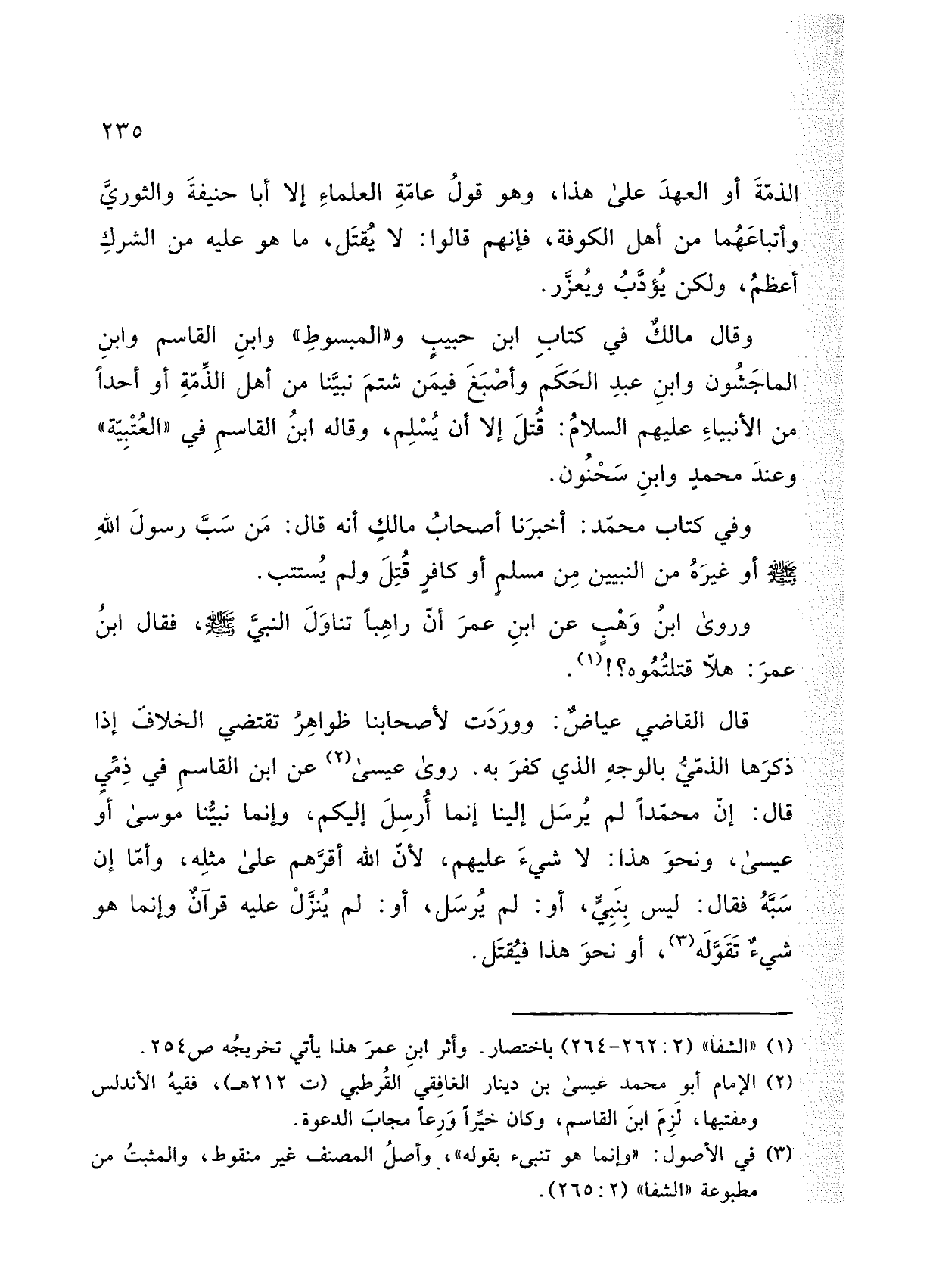 قال القاضي عياض: ووردت لأصحابنا ظواهر تقتضي الخلاف إذا ذكرها الذمي بالوجه الذي كفر به. روى عسى عن ابن القاسم في ذمي قال: إن محمدًا لم يرسل إلينا إنما أرسل إليكم، وإنما نبينا موسى أو عيسى، ونحو هذا: لا شيء عليهم، لأن الله أقرهم على مثله، وأما إن سبه فقال: ليس بنبي، أو: لم يرسل، أو: لم ينزل عليه قرآن وإنما هو شيء تقوله، أو نحو هذا فيقتل.