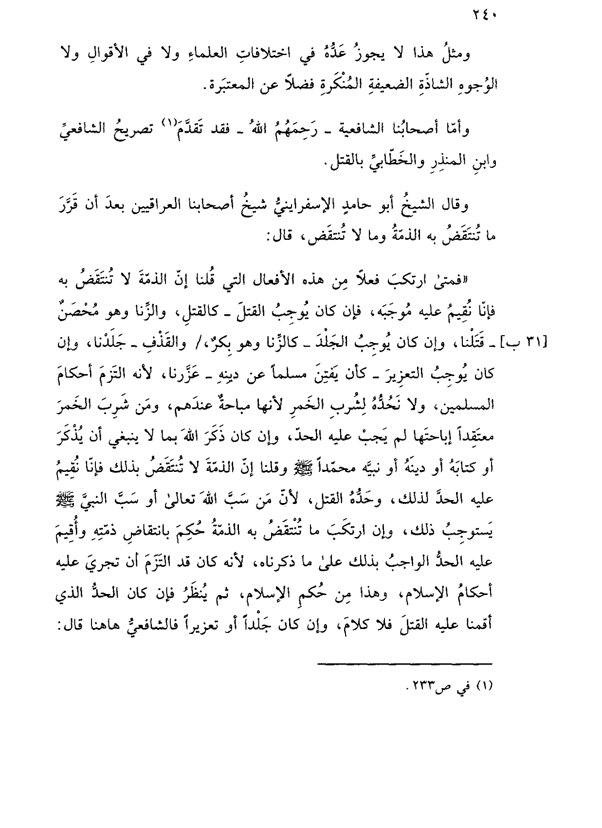 "فمتى ارتكب فعلاً من هذه الأفعال التي قلنا إن الذمة لا تنتفض به فإنا نقيم عليه موجبه، فإن كان يوجب القتل ـ كالقتل، والزنا وهو محصن قتلنا، وإن كان يوجب الجلد ـ كالزنا وهو بكر،/ والقذف ـ جلدنا، وإن كان يوجب التعزيز ـ كأن يفتن مسلمًا عن دينه ـ عزرنا، لأنه التزم أحكام المسلمين، ولا نحده لشرب الخمر لأنها مباحة عندهم، ومن شرب الخمر معتقدًا إباحتها لم يجب عليه الحد، وإن كان ذكر الله بما لا ينبغي أن يذكر أو كتابه أو دينه أو نبيه محمدًا صلى الله عليه وسلم وقلنا إن الذمة لا تنتقض بذلك فإنا نقيم عليه الحد لذلك، وحده القتل، لأن من سب الله تعالى أو سب النبي صلى الله عليه وسلم يستوجب ذلك، وإن ارتكب ما تنتقض به الذمة حكم بانتقاض ذمته وأقيم عليه الحد الواجب بذلك على ما ذكرناه، لأنه كان قد التزم أن تجري عليه أحكام الإسلام، وهذا من حكم الإسلام، ثم ينظر فإن كان الحد الذي أقمنا عليه القتل فلا كلام، وإن كان جلدًا أو تعزيزًا فالشافعي هاهنا قال: