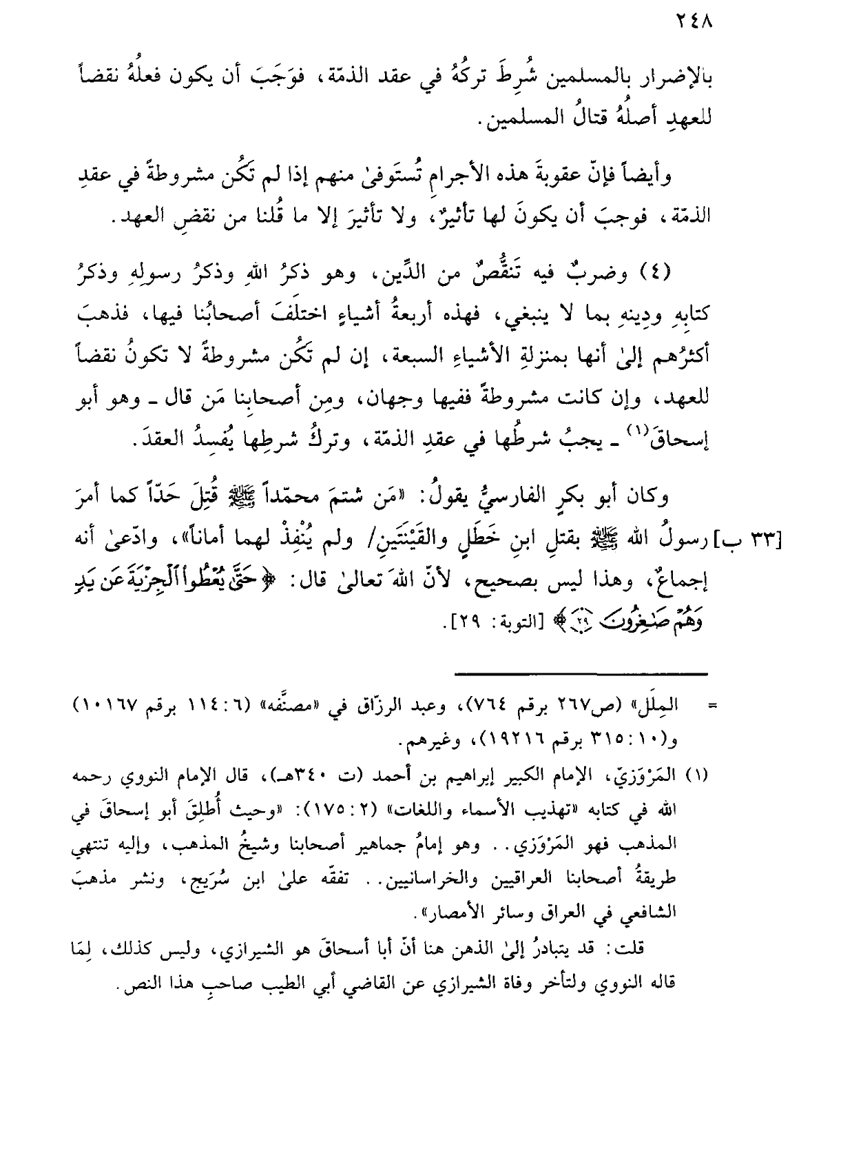 (4) وضرب فيه تنقص من الدين، وهو ذكر الله وذكر رسوله وذكر كتابه ودينه بما لا ينبغي، فهذه أربعة أشياء اختلف أصحابنا فيها، فذهب أكثرهم إلى أنها بمنزلة الأشياء السبعة، إن لم تكن مشروطة لا تكون نقضًا للعهد، وإن كانت مشروطة ففيها وجهان، ومن أصحابنا من قال ـ وهو أبو إسحاق ـ يجب شرطها في عقد الذمة، وترك شرطها يفسد العقد.