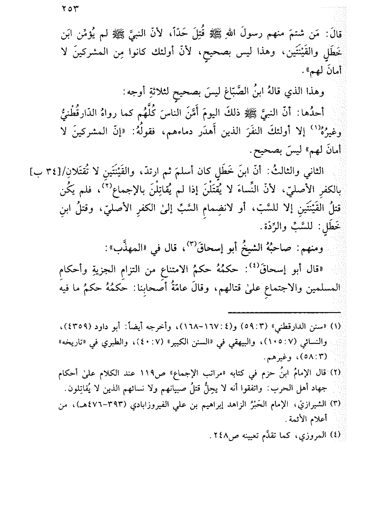 الثاني والثالث: أن ابن خطل كان أسلم ثم ارتد، والقينتين لا تقتلان/ بالكفر الأصلي، لأن النساء لا يقتلن إذا لم يقاتلن بالإجماع، فلم يكن قتل القينتين إلا للسب، أو لانضمام السب إلى الكفر الأصلي، وقتل ابن خطل: للسب والردة.