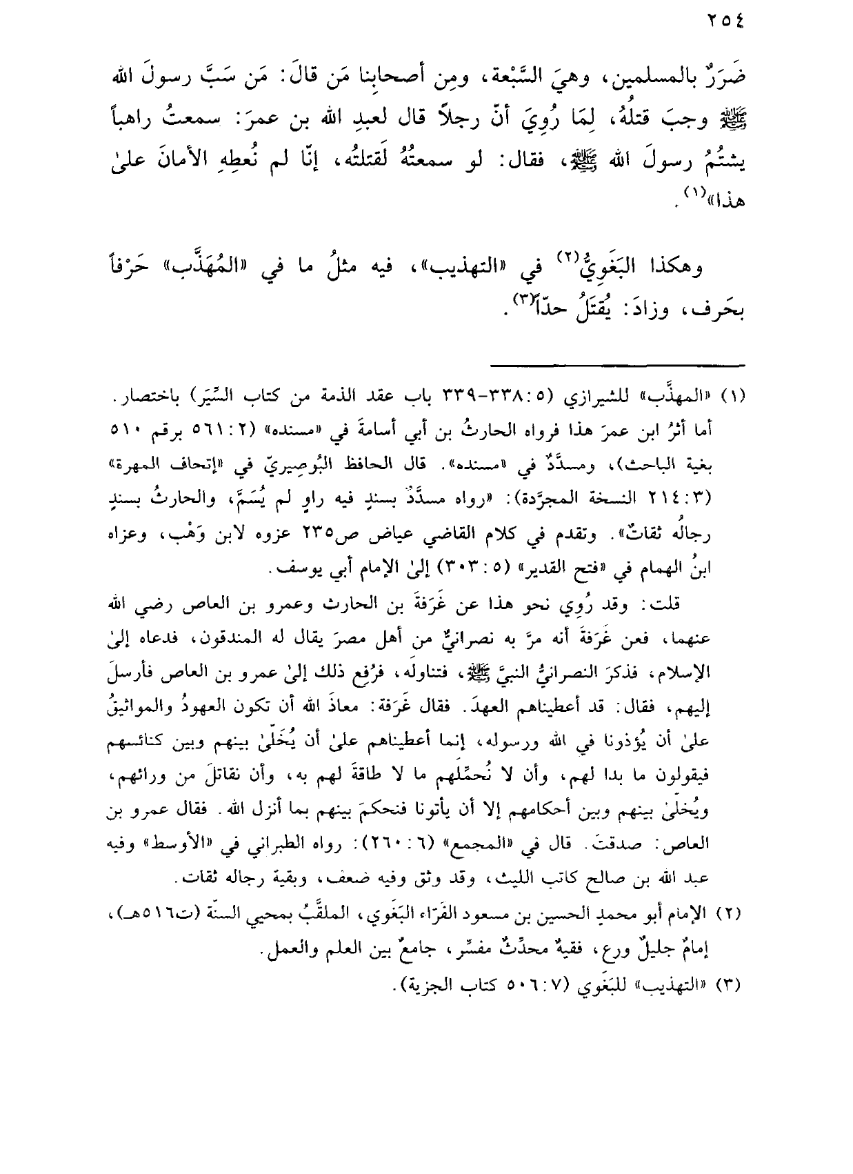 ضرر بالمسلمين، وهي السبعة، ومن أصحابنا من قال: من سب رسول الله صلى الله عليه وسلم وجب قتله، لما روي أن رجلاً قال لعبد الله بن عمر: سمعت راهبًا يشتم رسول الله صلى الله عليه وسلم، فقال: لو سمعته لقتلته، إنا لم نعطه الأمان على هذا".