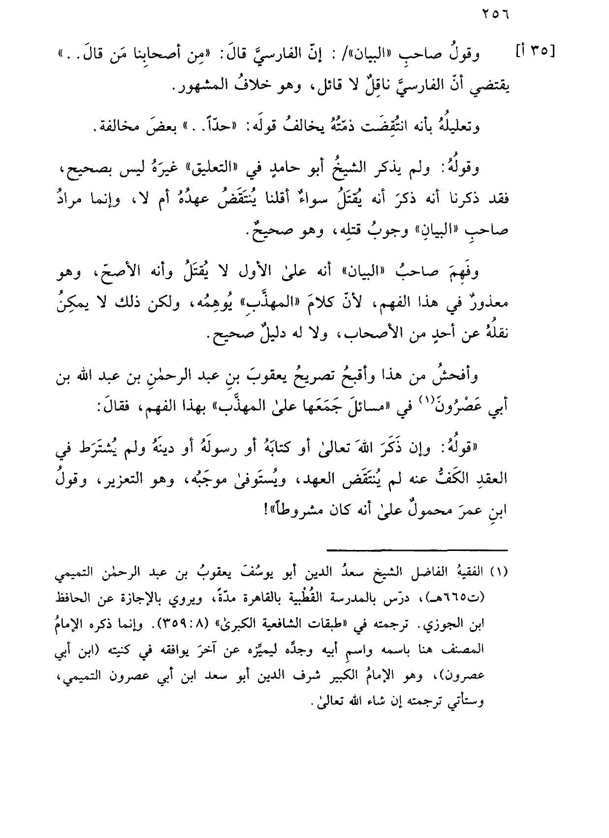 وأفحش من هذا وأقبح تصريح يعقوب بن عبد الرحمن بن عبد الله بن أبي عصرون في "مسائل جمعها على المهذب" بهذا الفهم، فقال: "قوله: وإن ذكر الله تعالى أو كتابه أو رسوله أو دينه ولم يشترط في العقد الكف عنه لم ينتقض العهد، ويستوفى موجبه، وهو التعزيز، وقول ابن عمر محمول على أنه كان مشروطًا"!
