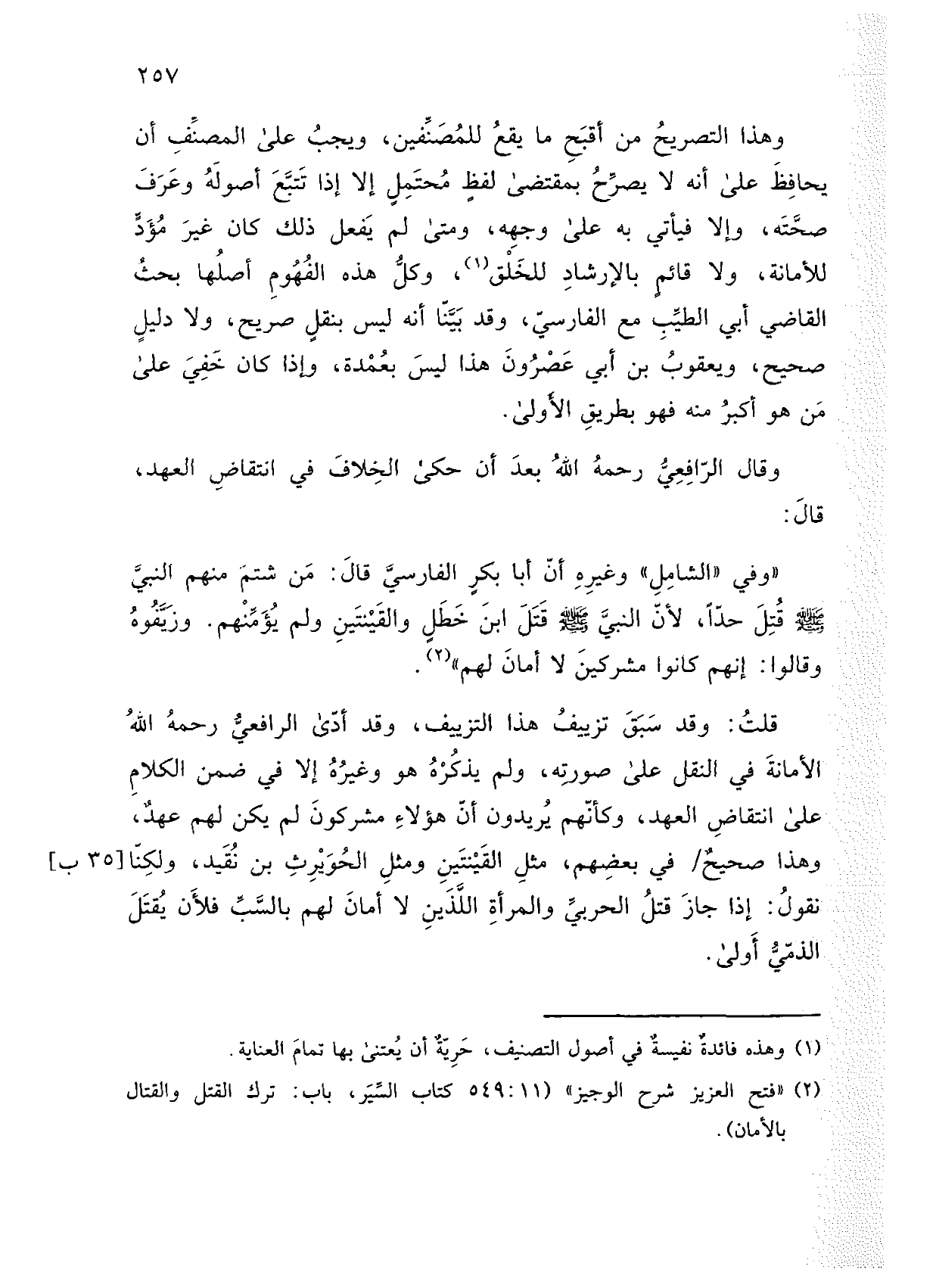 قلت: وقد سبق تزييف هذا التزييف، وقد أدى الرافعي رحمه الله الأمانة في النقل على صورته، ولم يذكره هو وغيره إلا في ضمن الكلام على انتقاض العهد، وكأنهم يريدون أن هؤلاء مشركون لم يكن لهم عهد، وهذا صحيح/ في بعضهم، مثل القينتين ومثل الحويرث بن نقيد، ولكنا نقول: إذا جاز قتل الحربي والمرأة اللذين لا أمان لهم بالسب فلأن يقتل الذمي أولى.