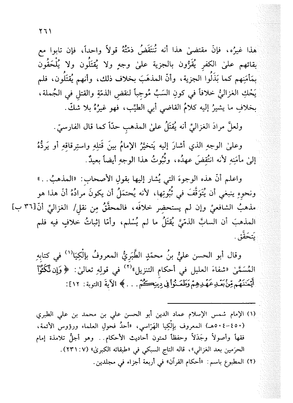 وقال أبو الحسن علي بن محمد الطبري المعروف بإلكيا في كتابه المسمى "شفاء العليل في أحكام التنزيل" في قوله تعالى: "وإن نكثوا أيمانهم من بعد عهدهم وطعنوا في دينكم ...) الآية [التوبة: 12]: