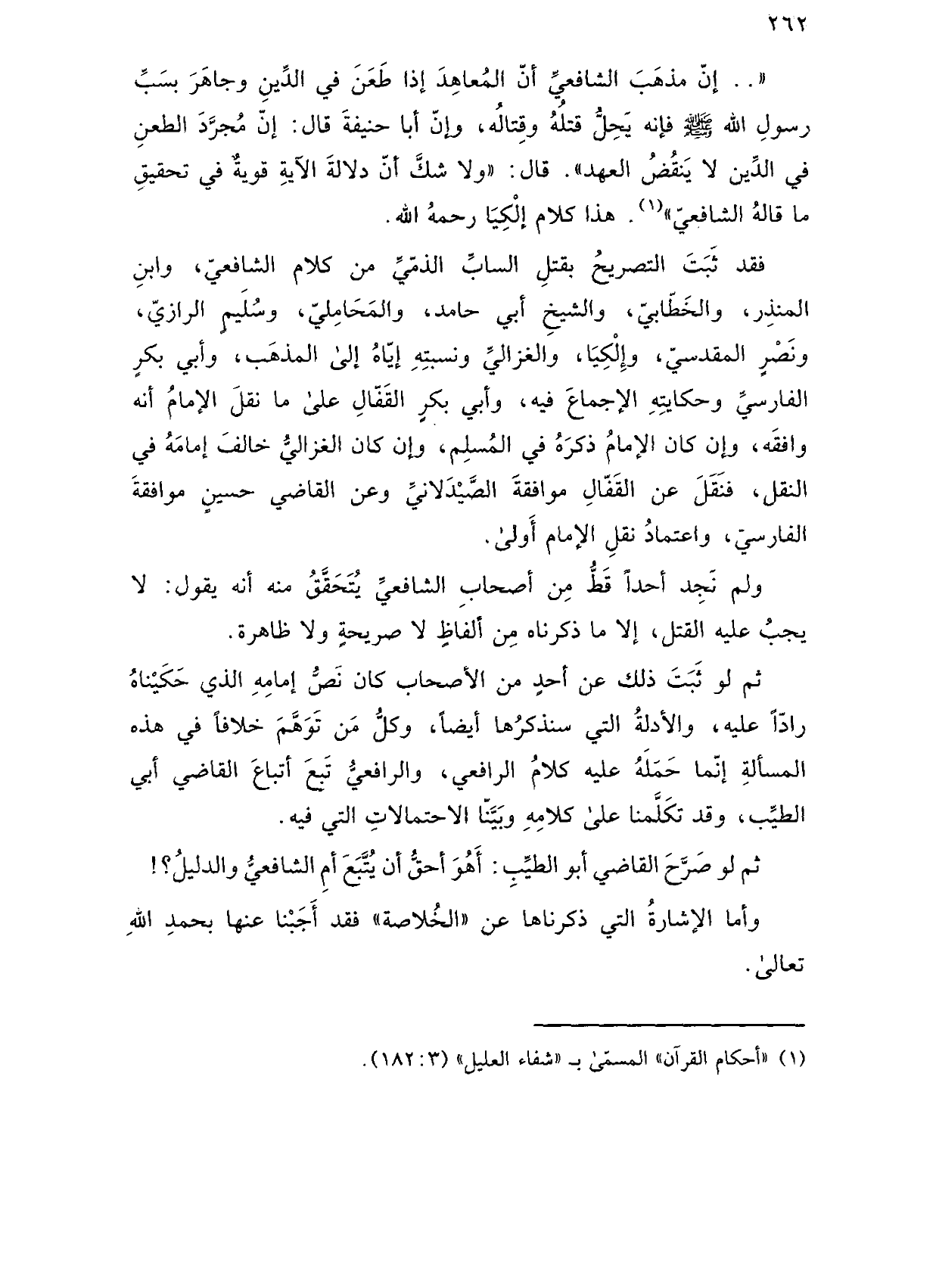 " .. إن مذهب الشافعي أن المعاهد إذا طعن في الدين وجاهر بسب رسول الله صلى الله عليه وسلم فإنه يحل قتله وقتاله، وإن أبا حنيفة قال: إن مجرد الطعن في الدين لا ينقض العهد". قال: "ولا شك أن دلالة الآية قوية في تحقيق ما قاله الشافعي". هذا كلام إلكيا رحمه الله.