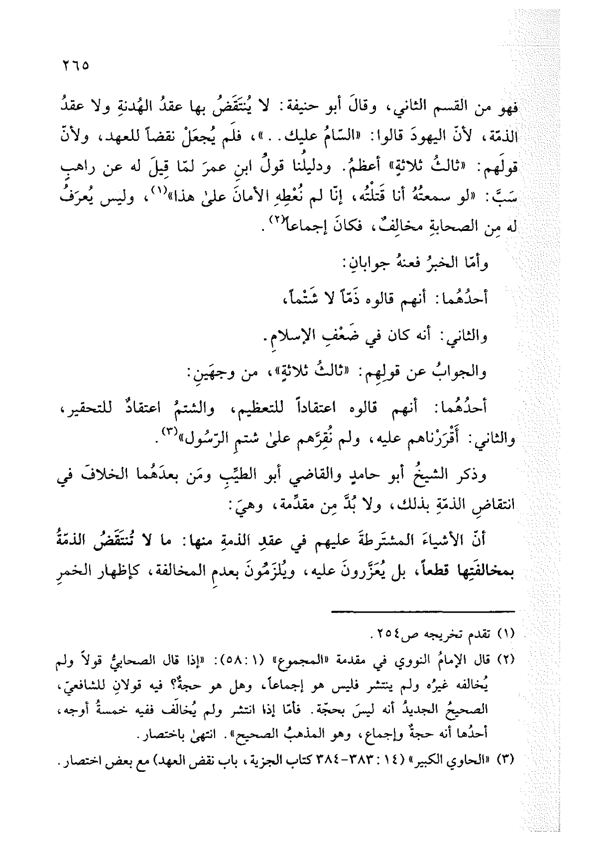 فهو من القسم الثاني، وقال أبو حنيفة: لا ينتقض بها عقد الهدنة ولا عقد الذمة، لأن اليهود قالوا: "السام عليك .. "، فلم يجعل نقضًا للعهد، ولأن قولهم: "ثالث ثلاثة" أعظم. ودليلنا قول ابن عمر لما قيل له عن راهب سب: "لو سمعته أنا قتلته، إنا لم نعطه الأمان على هذا"، وليس يعرف له من الصحابة مخالف، فكان إجماعًا.