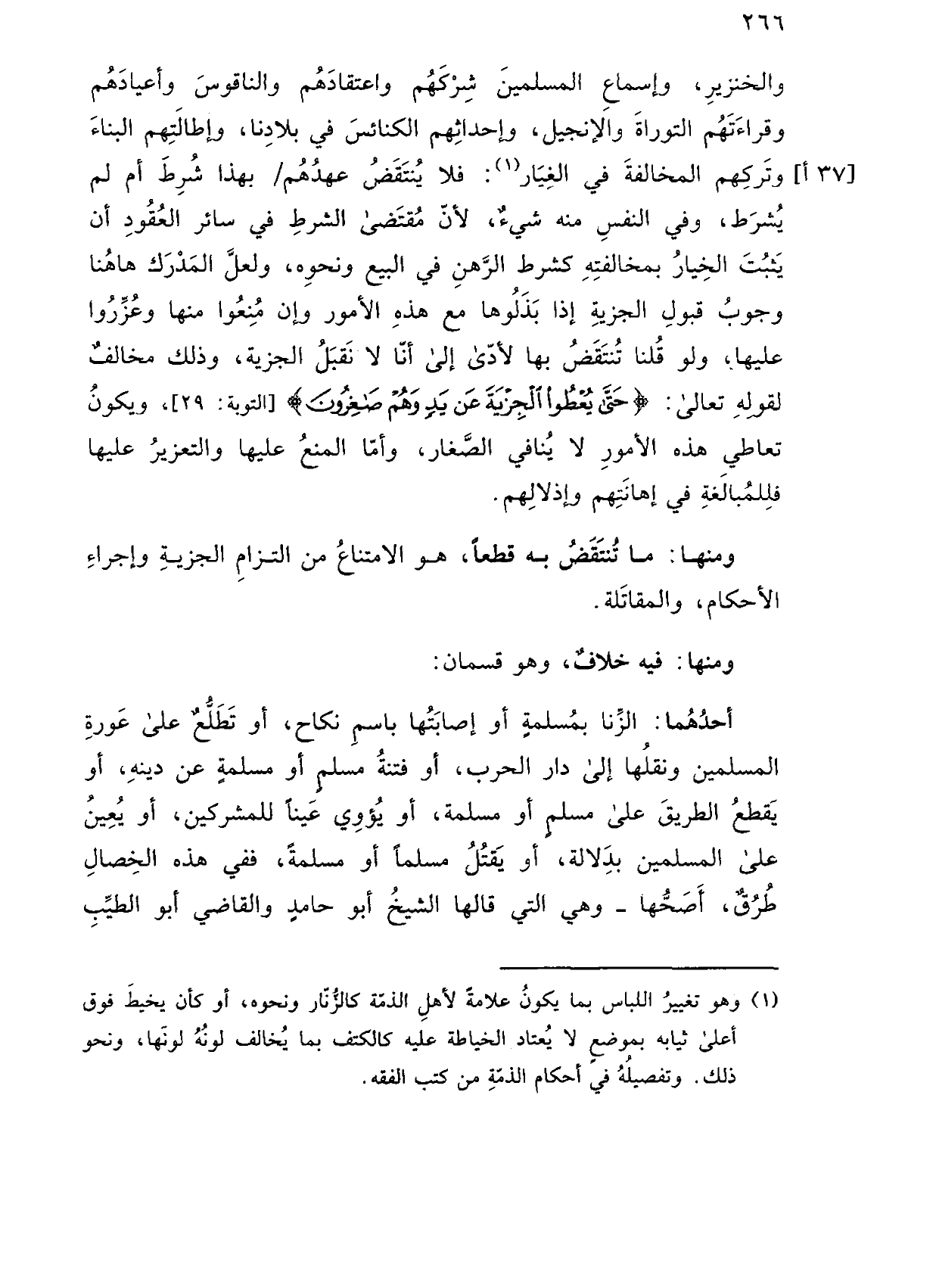 والخنزير، وإسماع المسلمين شركهم واعتقادهم والناقوس وأعيادهم وقراءتهم التوراةَ والإنجيل، وإحداثِهم الكنائس في بلادنا، وإطالتهم البناء وتركهم المخالفة في الغيار: فلا ينتقض عهدهم/ بهذا شرط أم لم يشرط، وفي النفس منه شيء، لأن مُقتَضى الشرط في سائر العقود أن يثبت الخيار بمخالفته كشرط الرهن في البيع ونحوِه، ولعل المدرك هاهنا وجوب قبول الجزية إذا بذلوها مع هذه الأمور وإن منعوا منها وعزروا عليها، ولو قلنا تنتقض بها لأدى إلى أنا لا نقبل الجزية، وذلك مخالف لقوله تعالى: (حتى يعطوا الجزية عن يدٍ وهم صاغرون) [التوبة: 29]، ويكون تعاطي هذه الأمور لا ينافي الصغار، وأما المنع عليها والتعزيز عليها فللمبالغة في إهانتهم وإذلالهم.