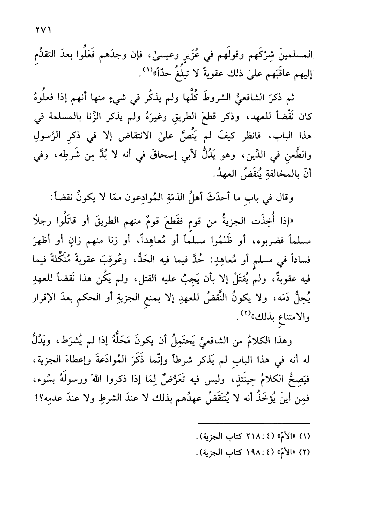 "إذا أخذت الجزية من قوم فقطع قوم منهم الطريق أو قاتلوا رجلاً مسلمًا فضربوه، أو ظلموا مسلمًا أو معاهدًا، أو زنا منهم زانٍ أو أظهر فسادًا في مسلم أو معاهد: حد فيما فيه الحد، وعوقب عقوبة منكلة فيما فيه عقوبة، ولم يقتل إلا بأن يجب عليه القتل، ولم يكن هذا نقضًا للعهد يحل دمه، ولا يكون النقض للعهد إلا بمنع الجزية أو الحكم بعد الإقرار والامتناع بذلك".