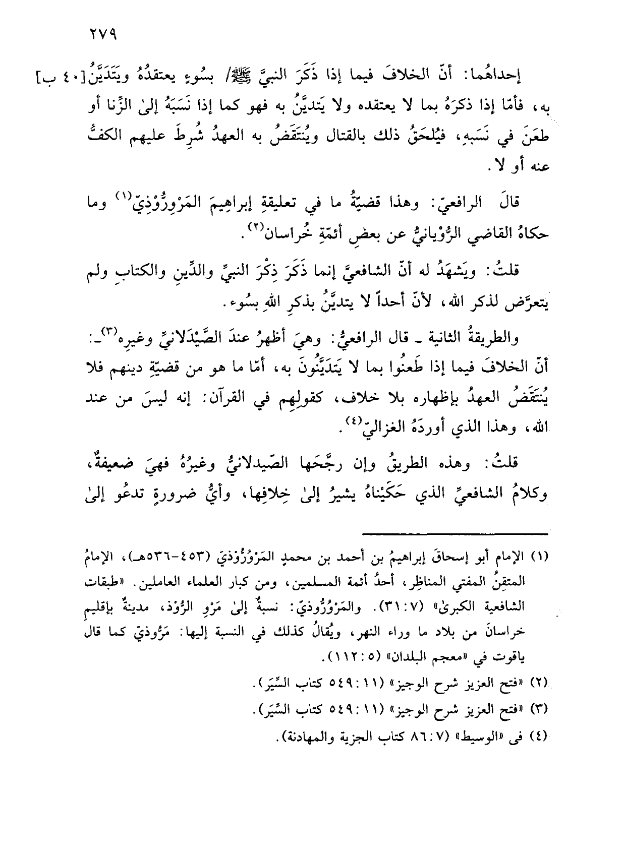 والطريقة الثانية ـ قال الرافعي: وهي أظهر عند الصيدلاني وغيره ـ: أن الخلاف فيما إذا طعنوا بما لا يتدينون به، أما ما هو من قضية دينهم فلا ينتقض العهد بإظهاره بلا خلاف، كقولهم في القرآن: إنه ليس من عند الله، وهذا الذي أورده الغزالي.