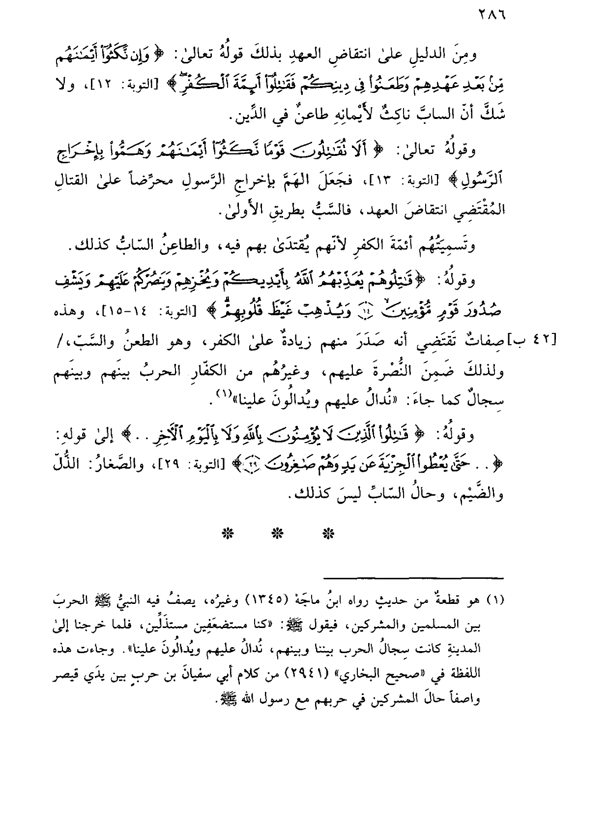 وقوله: (قاتلوهم يعذبهم الله بأيديكم ويخزهم وينصركم عليهم ويشف صدور قوم مؤمنين (14) ويذهب غيظ قلوبهم) [التوبة: 14 - 15]، وهذه صفات تقتضي أنه صدر منهم زيادة على الكفر، وهو الطعن والسب،/ ولذلك ضمن النصرة عليهم، وغيرهم من الكفار الحرب بينهم وبينهم سجال كما جاء: "ندال عليهم ويدالون علينا".