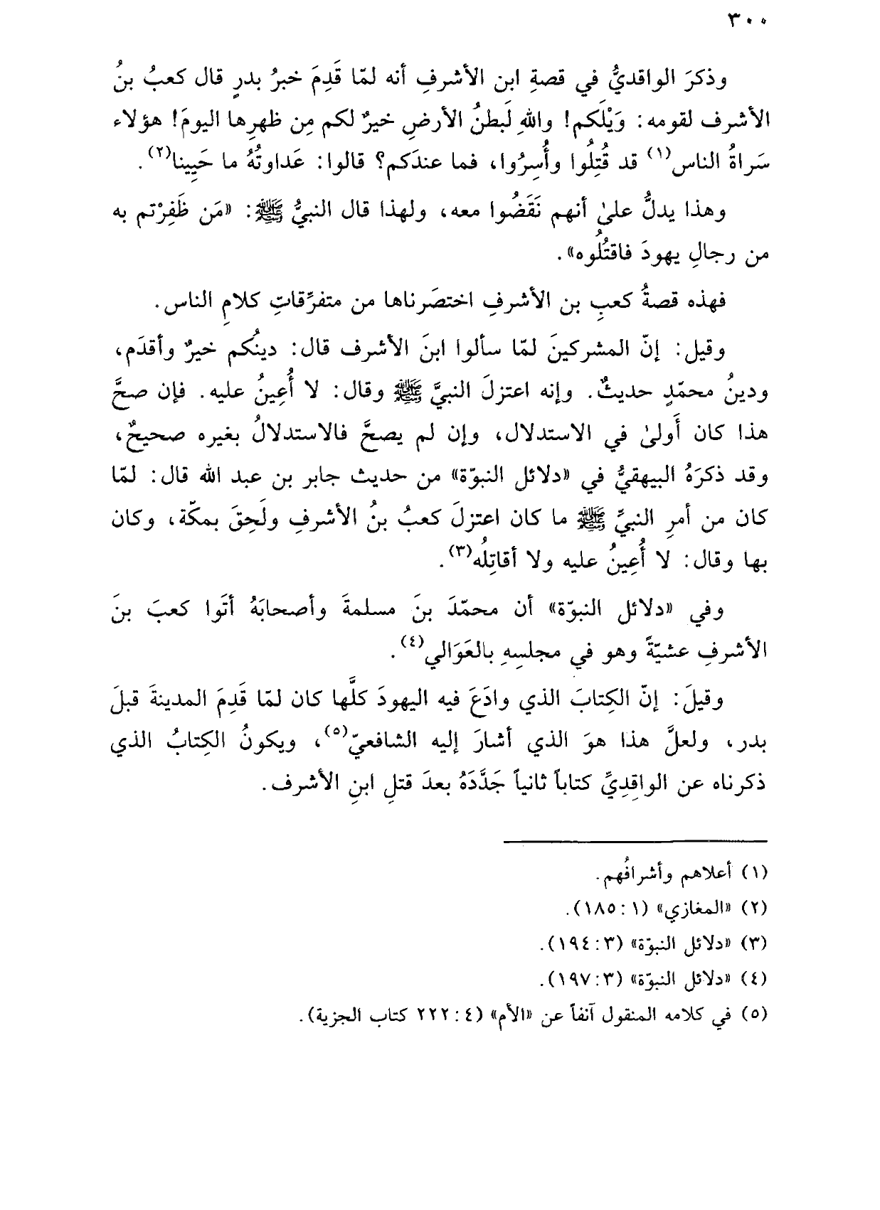 وقيل: إن الكتاب الذي وادع فيه اليهود كلها كان لما قدم المدينة قبل بدر، ولعل هذا هو الذي أشار إليه الشافعي، ويكون الكتاب الذي ذكرناه عن الواقدي كتابًا ثانيًا جدده بعد قتل ابن الأشرف.