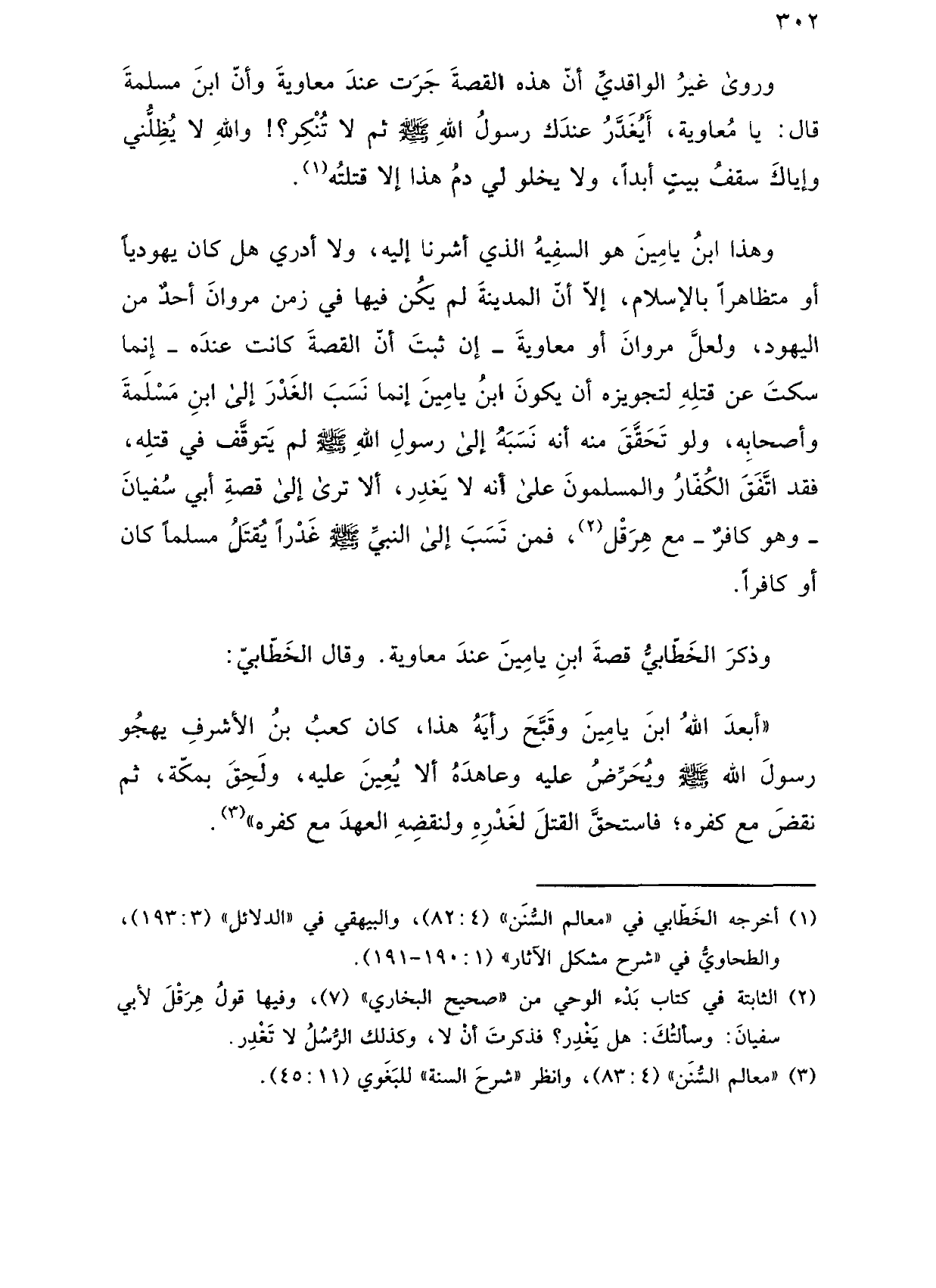 وهذا ابن يامين هو السفيه الذي أشرنا إليه، ولا أدري هل كان يهوديًا أو متظاهرًا بالإسلام، إلا أن المدينة لم يكن فيها في زمن مروان أحد من اليهود، ولعل مروان أو معاوية ـ إن ثبت أن القصة كانت عنده ـ إنما سكت عن قتله لتجويزه أن يكون ابن يامين إنما نسب الغدر إلى ابن مسلمة وأصحابه، ولو تحقق منه أنه نسبه إلى رسول الله صلى الله عليه وسلم لم يتوقف في قتله، فقد اتفق الكفار والمسلمون على أنه لا يغدر، ألا ترى إلى قصة أبي سفيان ـ وهو كافر ـ مع هرقل، فمن نسب إلى النبي صلى الله عليه وسلم غدرًا يقتل مسلمًا كان أو كافرًا.