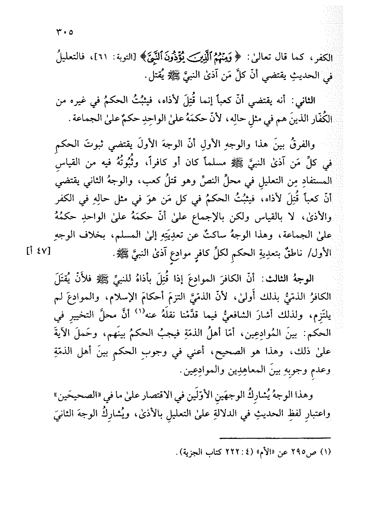 والفرق بين هذا والوجه الأول أن الوجه الأول يقتضي ثبوت الحكم في كل من آذى النبي صلى الله عليه وسلم مسلمًا كان أو كافرًا، وثبوته فيه من القياس المستفاد من التعليل في محل النص وهو قتل كعب، والوجه الثاني يقتضي أن كعبًا قتل لأذاه، فيثبت الحكم في كل من هو في مثل حاله في الكفر والأذى، لا بالقياس ولكن بالإجماع على أن حكمه على الواحد حكمه على الجماعة، وهذا الوجه ساكت عن تعديته إلى المسلم، بخلاف الوجه الأول/ ناطق بتعدية الحكم لكل كافر موادع آذى النبي صلى الله عليه وسلم.