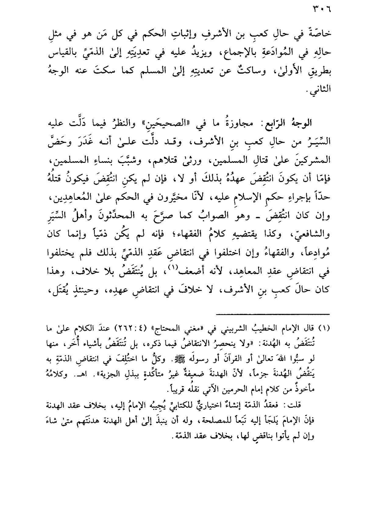 الوجه الرابع: مجاوزة ما في "الصحيحين" والنظر فيما دلت عليه السير من حال كعب بن الأشرف، وقد دلت على أنه غدر وحض المشركين على قتال المسلمين، ورثى قتلاهم، وشبب بنساء المسلمين، فإما أن يكون انتقض عهده بذلك أو لا، فإن لم يكن انتقض فيكون قتله حدًا بإجراء حكم الإسلام عليه، لأنا مخيرون في الحكم على المعاهدين، وإن كان انتقض ـ وهو الصواب كما صرح به المحدثون وأهل السير والشافعي، وكذا يقتضيه كلام الفقهاء؛ فإنه لم يكن ذميًا وإنما كان موادعًا، والفقهاء وإن اختلفوا في انتقاض عقد الذمي بذلك فلم يختلفوا في انتقاض عقد المعاهد، لأنه أضعف، بل ينتقض بلا خلاف، وهذا كان حال كعب بن الأشرف، لا خلاف في انتقاض عهده، وحينئذ يقتل،