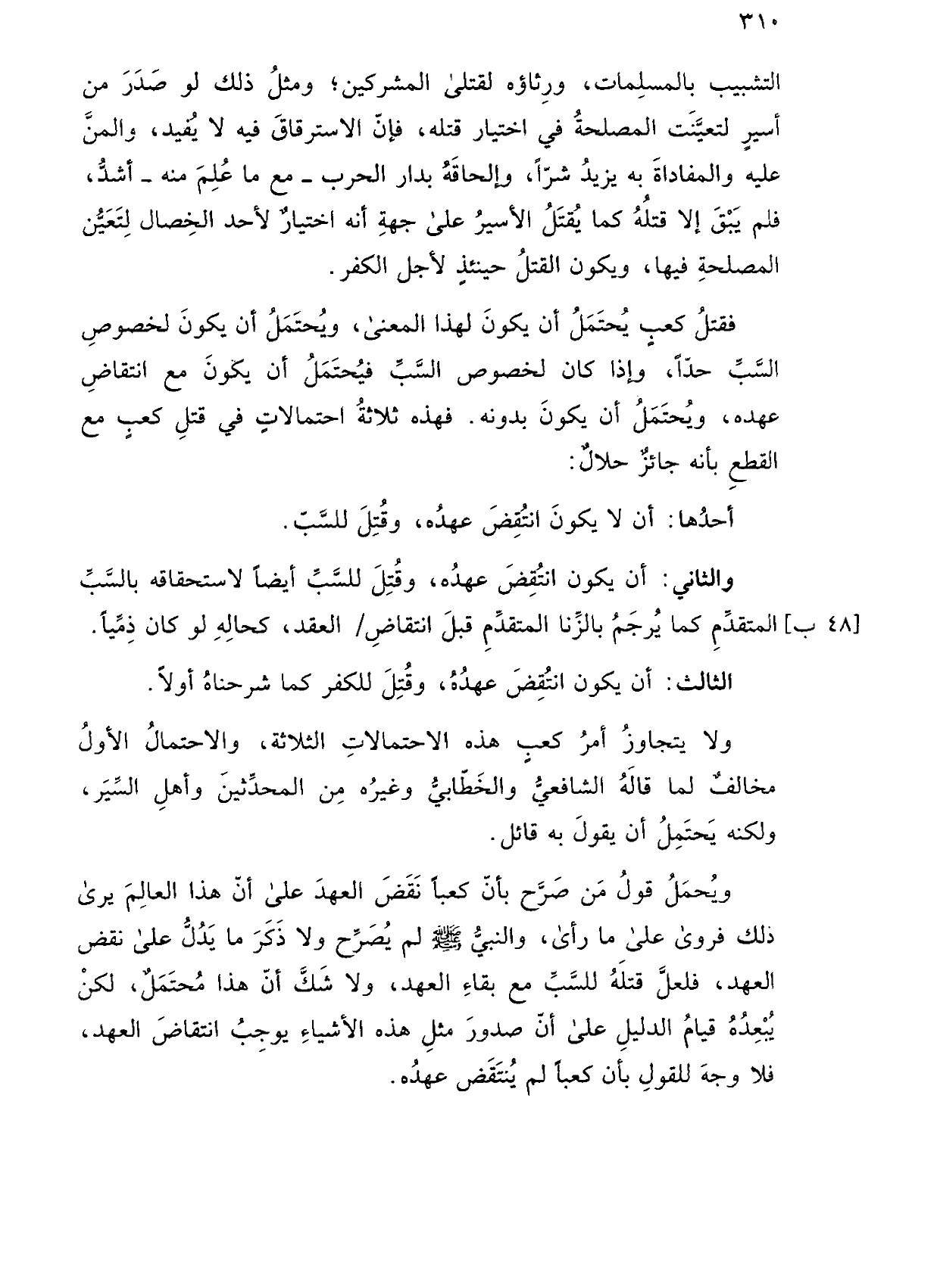 فقتل كعب يحتمل أن يكون لهذا المعنى، ويحتمل أن يكون لخصوص السب حدًا، وإذا كان لخصوص السب فيحتمل أن يكون مع انتقاض عهده، ويحتمل أن يكون بدونه. فهذه ثلاثة احتمالات في قتل كعب مع القطع بأنه جائز حلال: