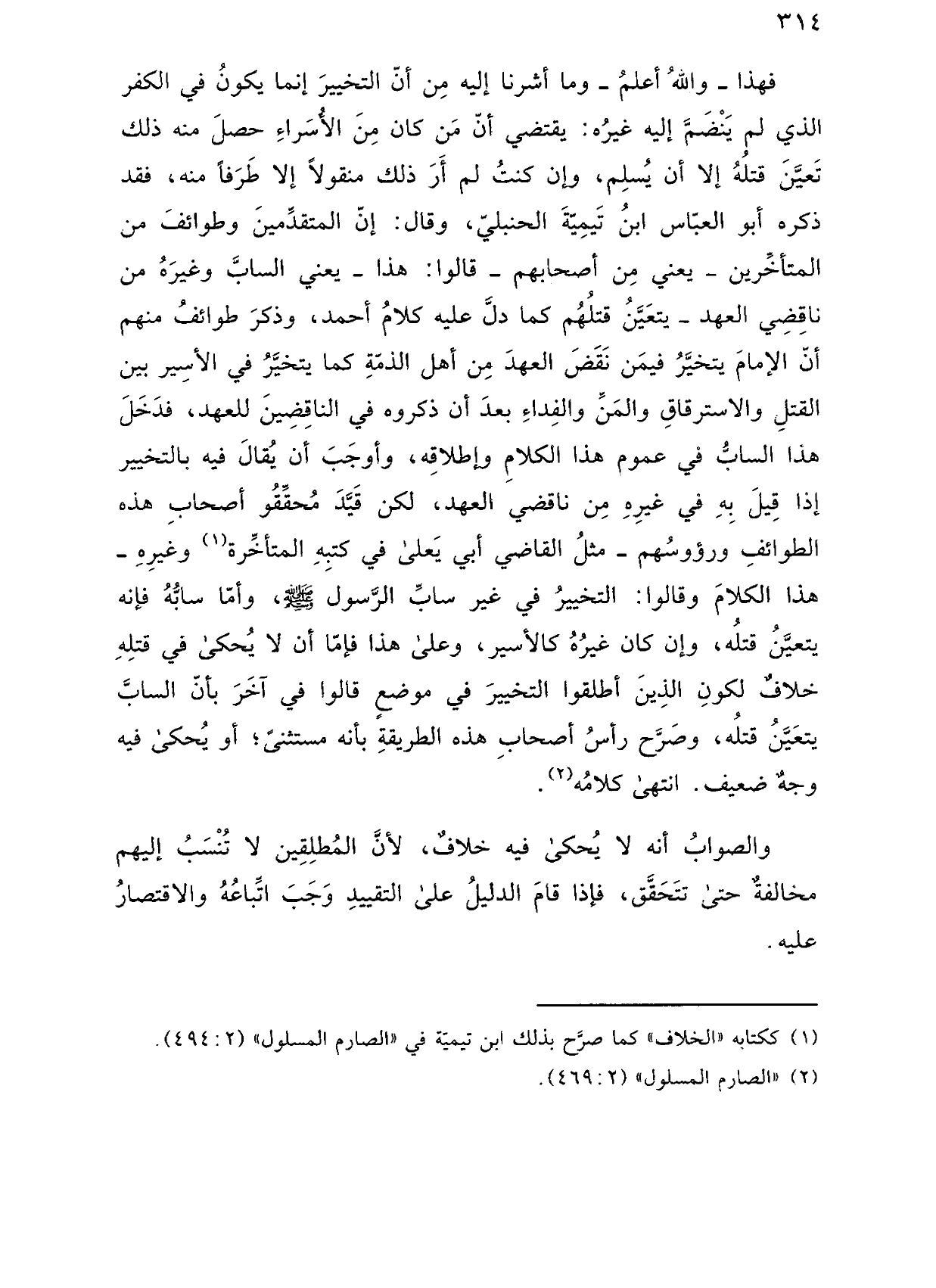 فهذا ـ والله أعلم ـ وما أشرنا إليه من أن التخيير إنما يكون في الكفر الذي لم ينضم إليه غيره: يقتضي أن من كان من الأسراء حصل منه ذلك تعين قتله إلا أن يسلم، وإن كنت لم أر ذلك منقولاً إلى طرفًا منه، فقد ذكره أبو العباس ابن تيمية الحنبلي، وقال: إن المتقدمين وطوائف من المتأخرين ـ يعني من أصحابهم ـ قالوا: هذا ـ يعني الساب وغيره من ناقضي العهد ـ يتعين قتلهم كما دل عليه كلام أحمد، وذكر طوائف منهم أن الإمام يتخير فيمن نقض العهد من أهل الذمة كما يتخير في الأسير بين القتل والاسترقاق والمن والفداء بعد أن ذكروه في الناقضين للعهد، فدخل هذا الساب في عموم هذا الكلام وإطلاقه، وأوجب أن يقال فيه بالتخيير إذا قيل به في غيره من ناقضي العهد، لكن قيد محققو أصحاب هذه الطوائف ورؤوسهم ـ مثل القاضي أبي يعلى في كتبه المتأخرة وغيره ـ هذا الكلام وقالوا: التخيير في غير ساب الرسول صلى الله عليه وسلم، وأما سابه فإنه يتعين قتله، وإن كان غيره كالاسير، وعلى هذا فإما أن لا يحكى في قتله خلاف لكون الذين أطلقوا التخيير في موضع قالوا في آخر بأن الساب يتعين قتله، وصرح رأس أصحاب هذه الطريقة بأن مستثنى؛ أو يحكى فيه وجه ضعيف. انتهى كلامه.