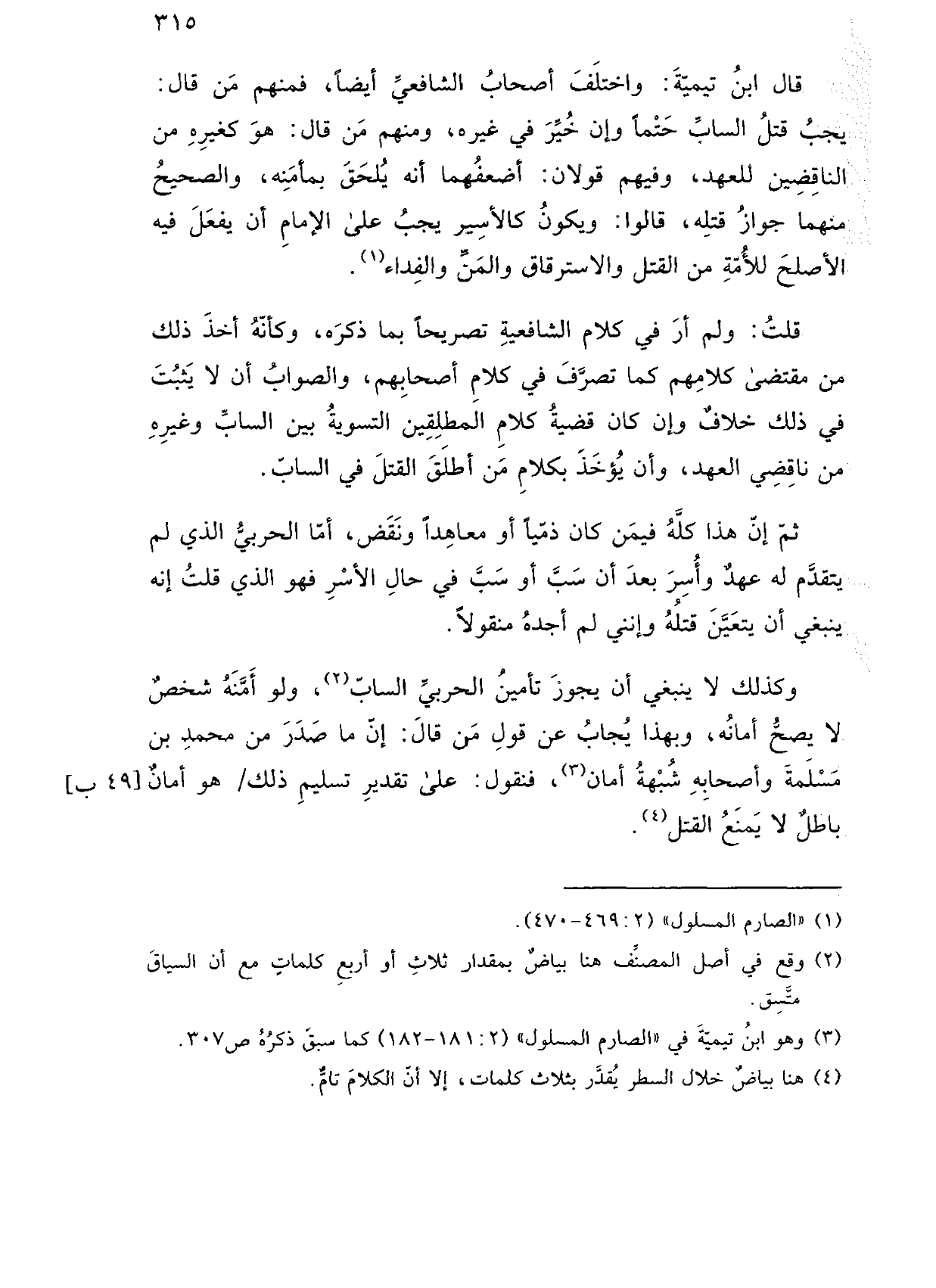 قال ابن تيمية: واختلف أصحاب الشافعي أيضًا، فمنهم من قال: يجب قتل الساب حتمًا وإن خير في غيره، ومنهم من قال: هو كغيره من الناقضين للعهد، وفيهم قولان: أضعفهما أنه يلحق بمأمنه، والصحيح منهما جواز قتله، قالوا: ويكون كالأسير يجب على الإمام أن يفعل فيه الأصلح للأمة من القتل والاسترقاق والمن والفداء.