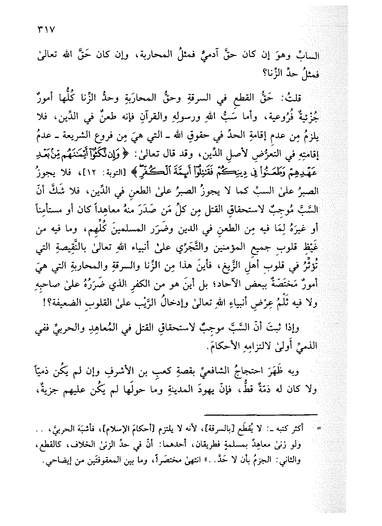 قلت: حق القطع في السرقة وحق المحاربة وحد الزنا كلها أمور جزئية فروعية، وأما سب الله ورسوله والقرآن فإنه طعن في الدين، فلا يلزم من عدم إقامة الحد في حقوق الله ـ التي هي من فروع الشريعة ـ عدم إقامته في التعرض لأصل الدين، وقد قال تعالى: (وإن نكثوا أيمانهم من بعد عهدهم وطعنوا في دينكم فقاتلوا أئمة الكفر) [التوبة: 12]، فلا يجوز الصبر على السب كما لا يجوز الصبر على الطعن في الدين، فلا شك أن السب موجب لاستحقاق القتل من كل من صدر منه معاهدًا كان أو مستأمنًا أو غيره لما فيه من الطعن في الدين وضرر المسلمين كلهم، وما فيه من غيظ قلوب جميع المؤمنين والتجري على أنبياء الله تعالى بالنقيصة التي تؤثر في قلوب أهل الزيغ، فأين هذا من الزنا والسرقة والمحاربة التي هي أمور مختصة ببعض الآحاد؛ بل أين هو من الكفر الذي ضرره على صاحبه ولا فيه ثلم عرض أنبياء الله تعالى وإدخال الريب على القلوب الضعيفة؟!
