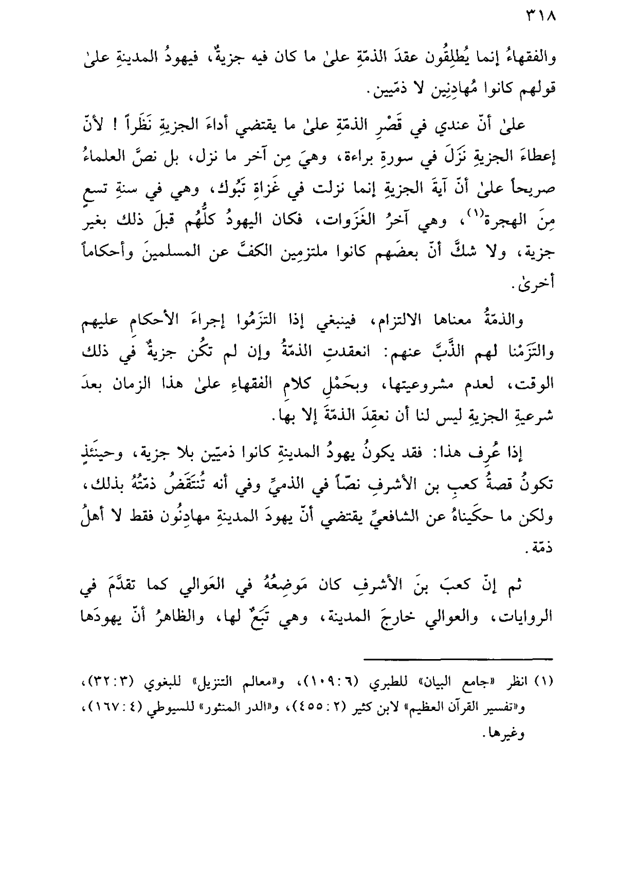 على أن عندي في قصر الذمة على ما يقتضي أداء الجزية نظرًا! لأن إعطاء الجزية نزل في سورة براءة، وهي من آخر ما نزل، بل نص العلماء صريحًا على أن آية الجزية إنما نزلت في غزاة تبوك، وهي في سنة تسع من الهجرة، وهي آخر الغزوات، فكان اليهود كلهم قبل ذلك بغير جزية، ولا شك أن بعضهم كانوا ملتزمين الكف عن المسلمين وأحكامًا أخرى.