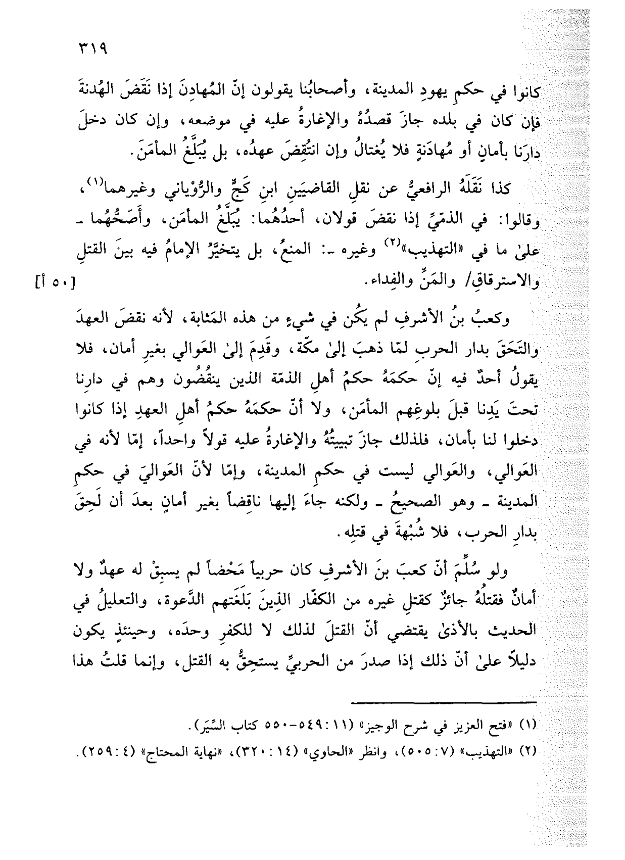 وكعب بن الأشرف لم يكن في شيء من هذه المثابة، لأنه نقض العهد والتحق بدار الحرب لما ذهب إلى مكة، وقدم إلى العوالي بغير أمان، فلا يقولُ أحد فيه إن حكمه حكم أهل الذمة الذين ينقضون وهم في دارنا تحت يدنا قبل بلوغهم المأمن، ولا أن حكمه حكم أهل العهد إذا كانوا دخلوا لنا بأمان، فلذلك جاز تبييته والإغارة عليه قولاً واحدًا، إما لأنه في العوالي، والعوالي ليست في حكم المدينة، وإما لأن العوالي في حكم المدينة ـ وهو الصحيح ـ ولكنه جاء إليها ناقضًا بغير أمان بعد أن لحق بدار الحرب، فلا شبهة في قتله.