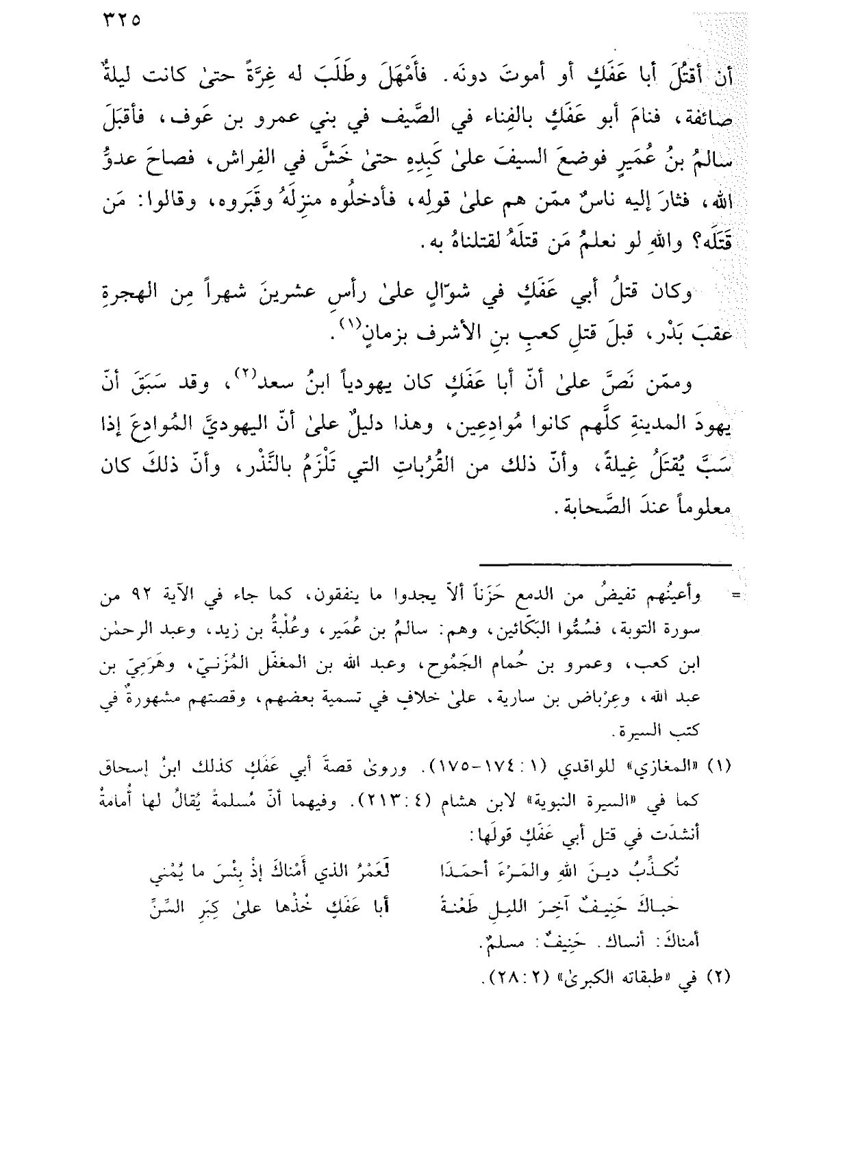 وممن نص على أن أبا عفك كان يهوديًا ابن سعد، وقد سبق أن يهود المدينة كلهم كانوا موادعين، وهذا دليل على أن اليهودي الموادع إذا سب يقتل غيلة، وأن ذلك من القربات التي تلزم بالنذر، وأن ذلك كان معلومًا عند الصحابة.
