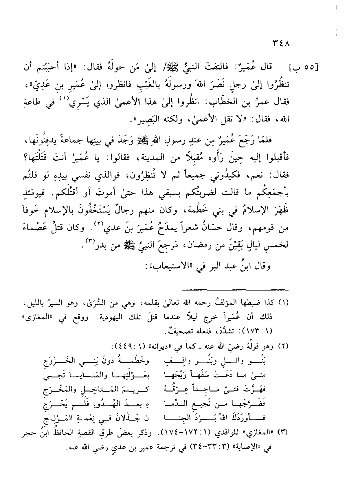 قال عمير: فالتفت النبي صلى الله عليه وسلم/ إلى من حوله فقال: "إذا أحببتم أن تنظروا إلى رجل نصر الله ورسوله بالغيب فانظروا إلى عمير بن عدي"، فقال عمر بن الخطاب: انظروا إلى هذا الأعمى الذي يسري في طاعة الله، فقال: "لا تقل الأعمى، ولكنه البصير".