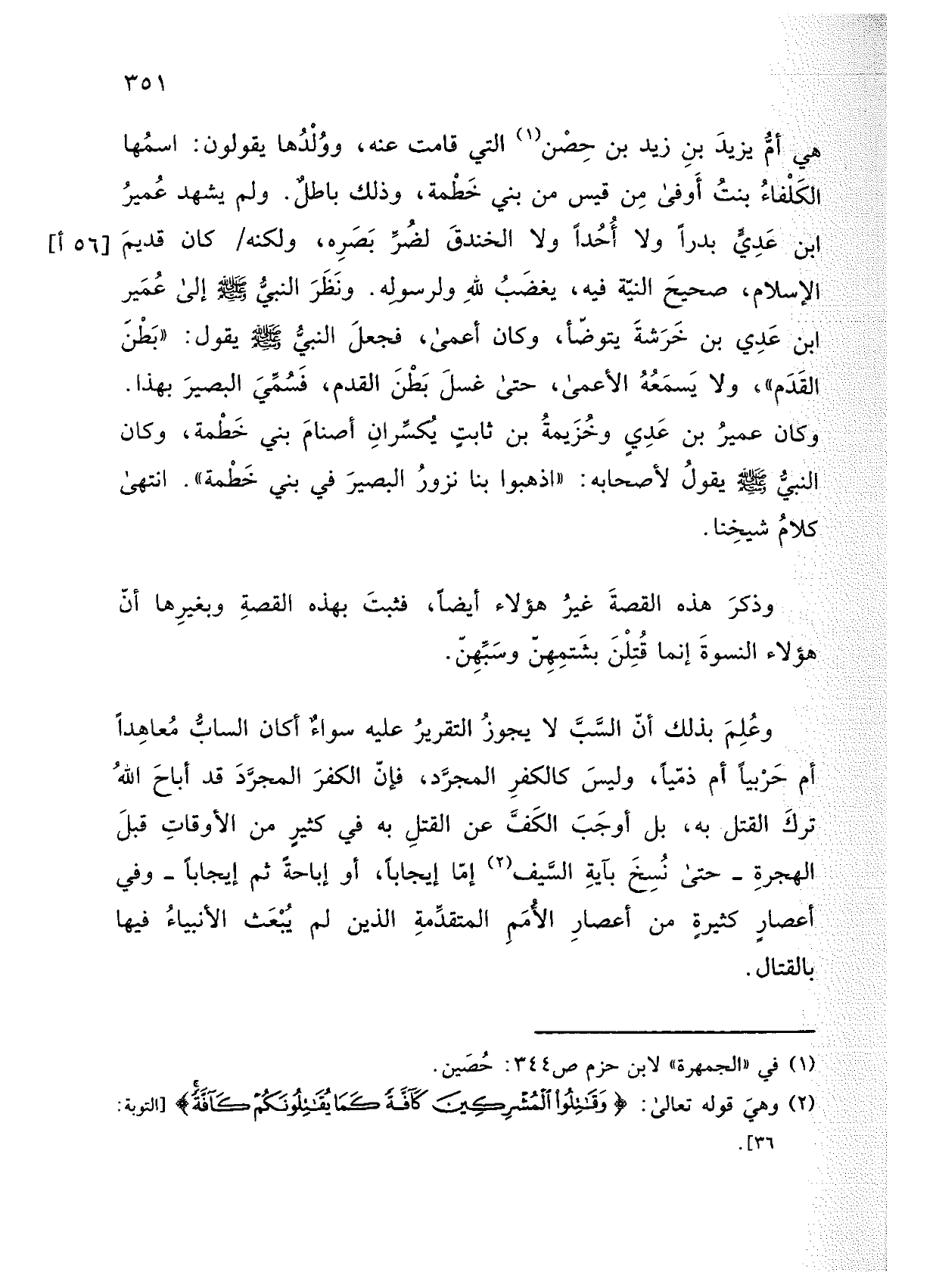 هي أم يزيد بن زيد بن حصن التي قامت عنه، وولدها يقولون: اسمها الكلفاء بنت أوفى من قيس من بني خطمة، وذلك باطل. ولم يشهد عمير ابن عدي بدرًا ولا أحدًا ولا الخندق لضر بصره، ولكنه/ كان قديم الإسلام، صحيح النية فيه، يغضب لله ولرسوله. ونظر النبي صلى الله عليه وسلم إلى عمير ابن عدي بن خرشة يتوضأ، وكان أعمى، فجعل النبي صلى الله عليه وسلم يقول: "بطن القدم"، ولا يسمعه الأعمى، حتى غسل بطن القدم، فسمي البصير بهذا. وكان عمير بن عدي وخزيمة بن ثابت يكسران أصنام بني خطمة، وكان النبي صلى الله عليه وسلم يقول لأصحابه: "اذهبوا بنا نزور البصير في بني خطمة". انتهى كلام شيخنا.