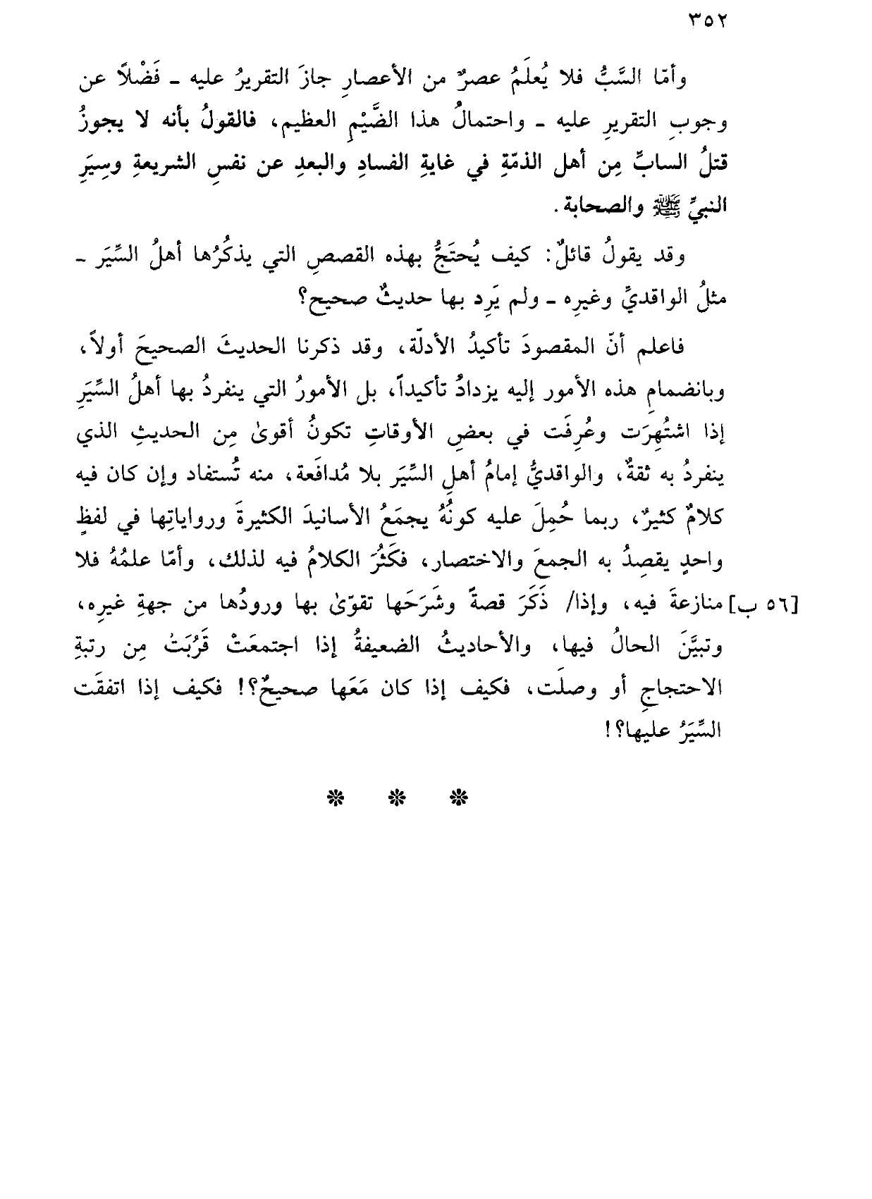 فاعلم أن المقصود تأكيد الأدلة، وقد ذكرنا الحديث الصحيح أولاً، وبانضمام هذه الأمور إليه يزداد تأكيدًا، بل الأمور التي ينفرد بها أهل السير إذا اشتهرت وعرفت في بعض الأوقات تكون أقوى من الحديث الذي ينفرد به ثقة، والواقدي إمام أهل السير بلا مدافعة، منه تستفاد وإن كان فيه كلام كثير، ربما حمل عليه كونه يجمع الأسانيد الكثيرة ورواياتها في لفظ واحد يقصد به الجمع والاختصار، فكثير الكلام فيه لذلك، وأما علمه فلا منازعة فيه، وإذا/ ذكر قصة وشرحها تقوى بها ورودها من جهة غيره، وتبين الحال فيها، والأحاديث الضعيفة إذا اجتمعت قربت من رتبة الاحتجاج أو وصلت، فكيف إذا كان معها صحيح؟! فكيف إذا اتفقت السير عليها؟!