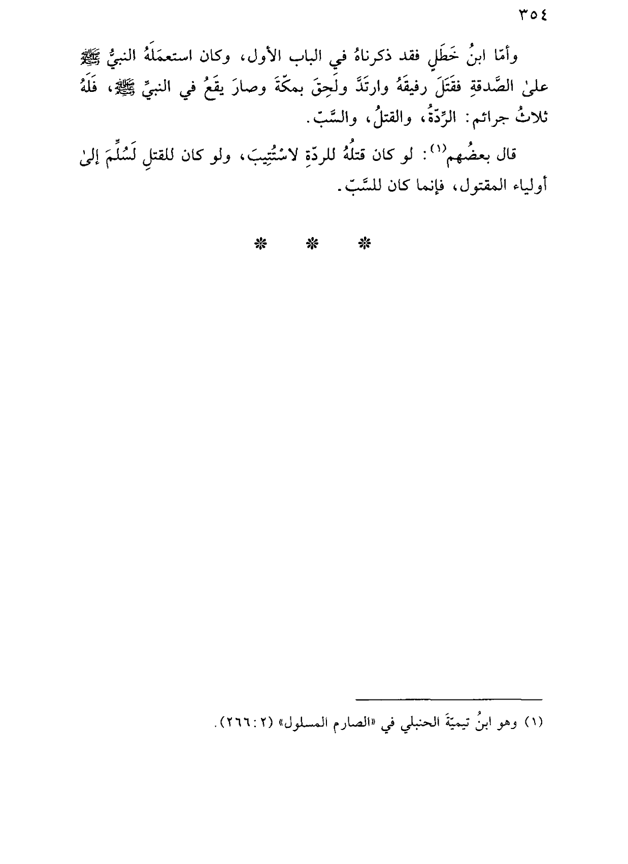 وأما ابن خطل فقد ذكرناه في الباب الأول، وكان استعمله النبي صلى الله عليه وسلم على الصدقة فقتل رفيقه وارتد ولحق بمكة وصار يقع في النبي صلى الله عليه وسلم، فله ثلاث جرائم: الردة، والقتل، والسب.