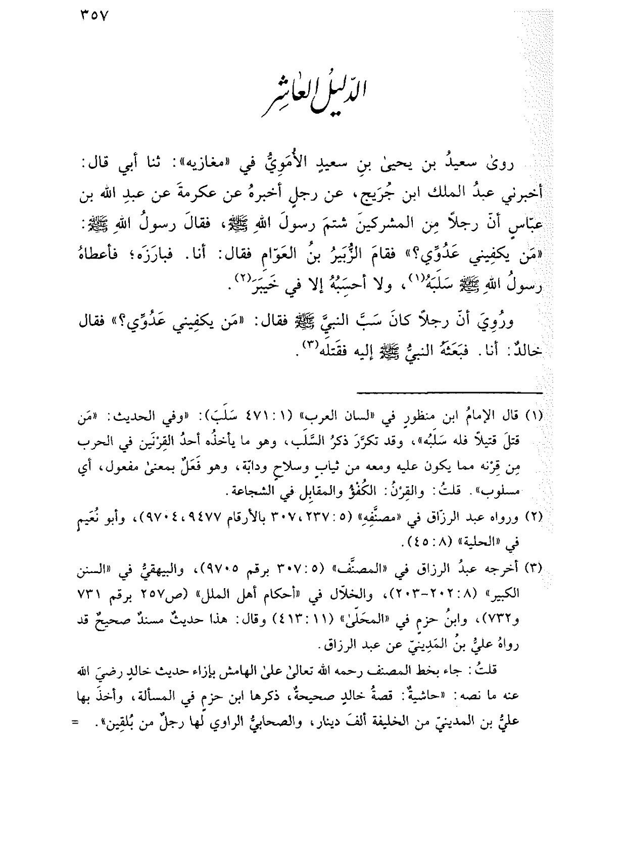 روى سعيد بن يحيى بن سعيد الأموي في "مغازيه": ثنا أبي قال: أخبرني عبد الملك ابن جريج، عن رجل أخبره عن عكرمة عن عبد الله بن عباس أن رجلاً من المشركين شتم رسول الله صلى الله عليه وسلم، فقال رسول الله صلى الله عليه وسلم: "من يكفيني عدوي؟ " فقام الزبير بن العوام فقال: أنا. فبارزه؛ فأعطاه رسول الله صلى الله عليه وسلم سلبه، ولا أحسبه إلا في خيبر.