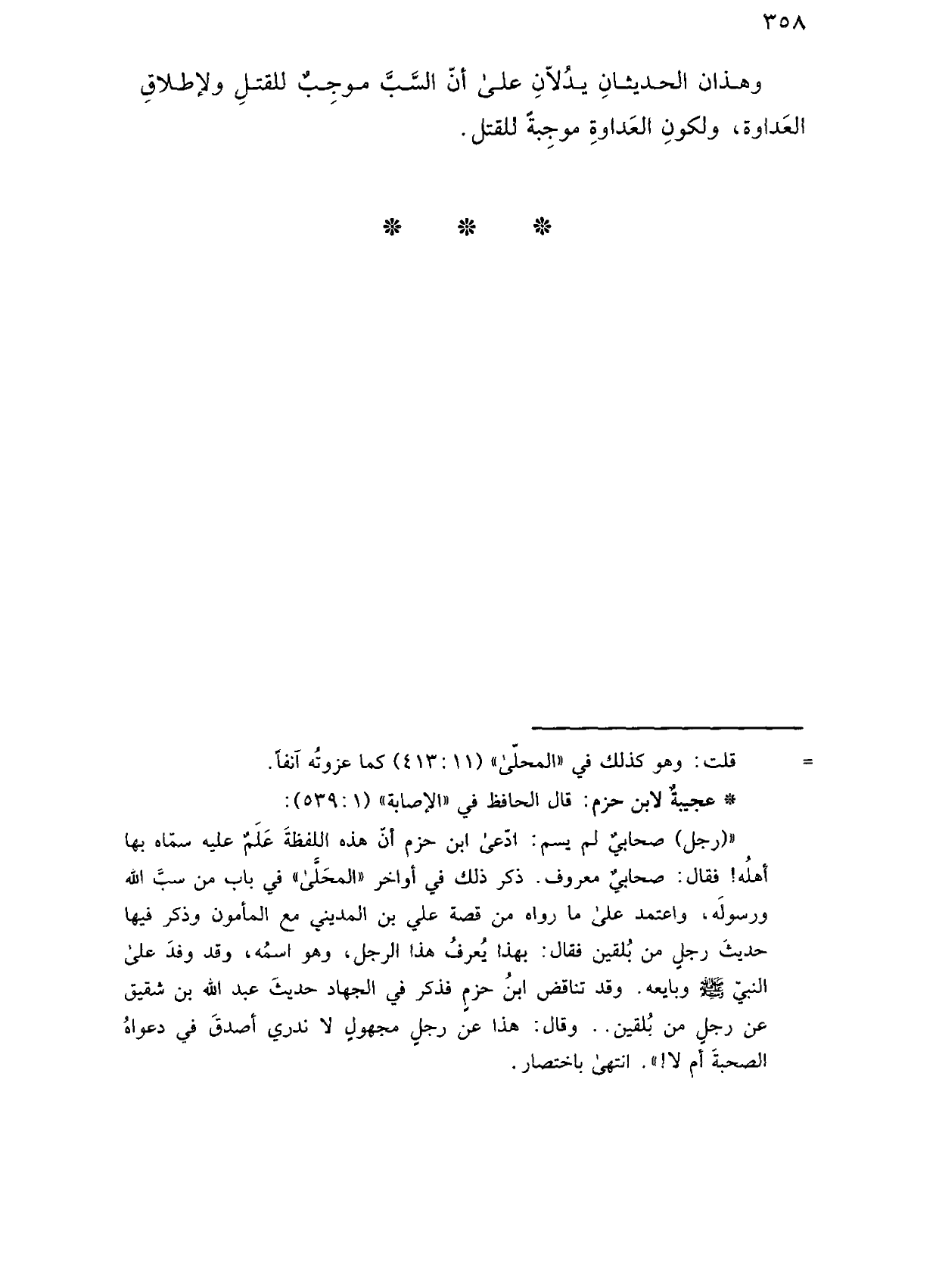 وهذان الحديثان يدلان على أن السب موجب للقتل ولإطلاق العداوة، ولكون العداوة موجبة للقتل.