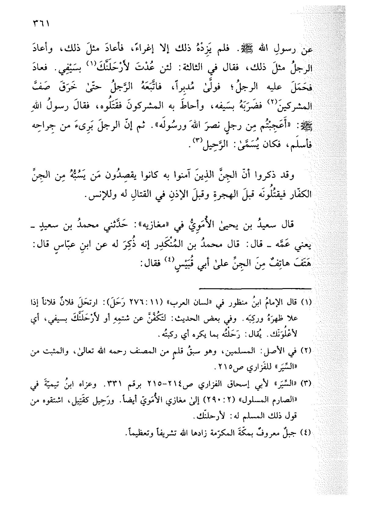 عن رسول الله صلى الله عليه وسلم. فلم يزده ذلك إلا إغراء، فأعاد مثل ذلك، وأعاد الرجل مثل ذلك، فقال في الثالثة: لئن عدت لأرحلنك بسيفي. فعاد فحمل عليه الرجل؛ فولى مدبرًا، فاتبعه الرجل حتى خرق صف المشركين فضربه بسيفه، وأحاط به المشركون فقتلوه، فقال رسول الله صلى الله عليه وسلم: "أعجبتم من رجل نصر الله ورسوله". ثم إن الرجل برئ من جراحه فاسلم، فكان يسمى: الرحيل.