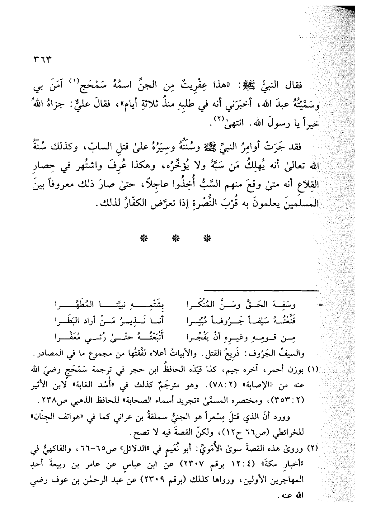 فقال النبي صلى الله عليه وسلم: "هذا عفريت من الجن اسمه سمحج آمن بي وسميته عبد الله، أخبرني أنه في طلبه منذ ثلاثة أيام"، فقال علي: جزاه الله خيرًا يا رسول الله. انتهى.