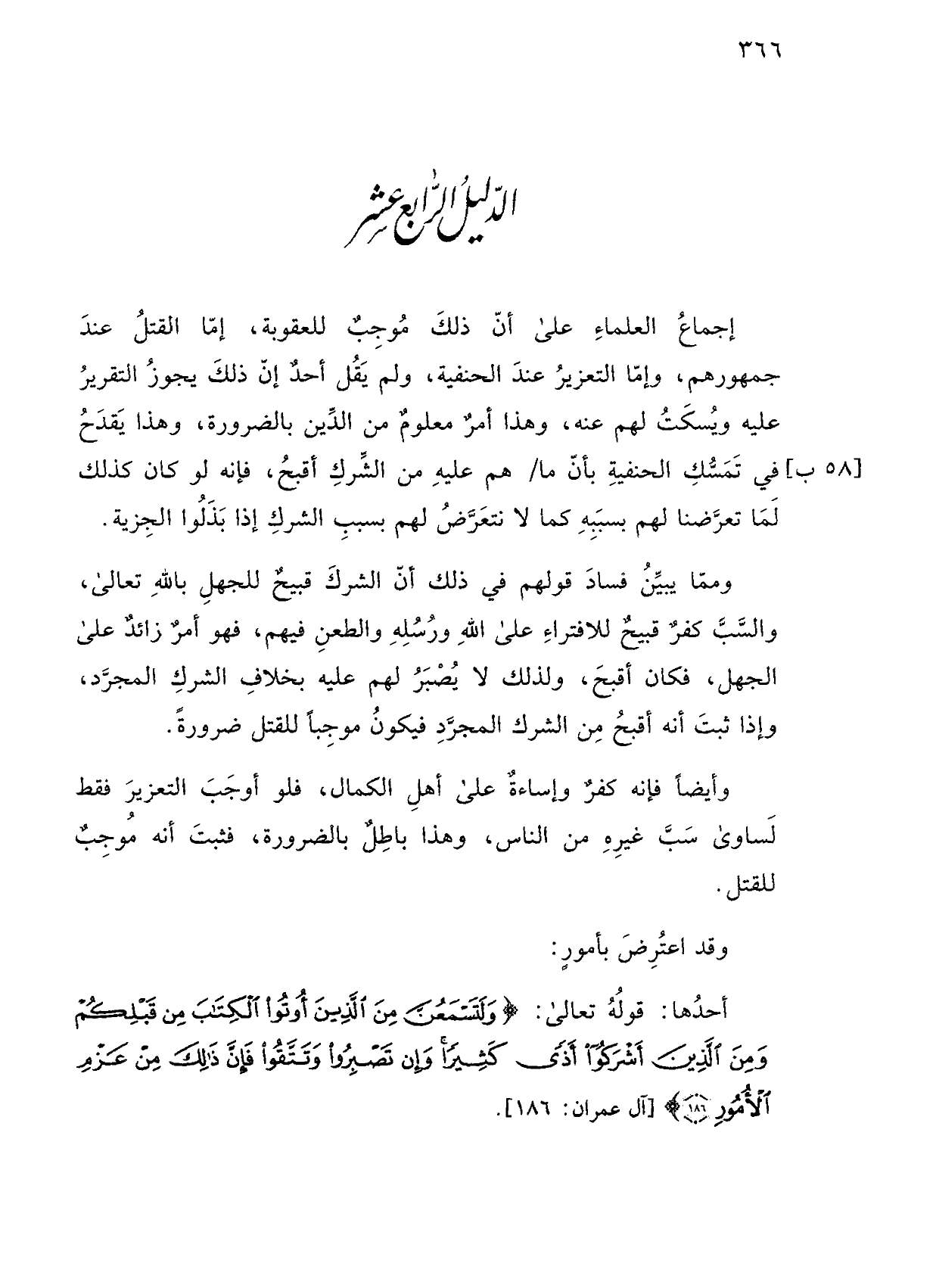 إجماع العلماء على أن ذلك موجب للعقوبة، إما القتل عند جمهورهم، وإما التعزير عند الحنفية، ولم يقل أحد إن ذلك يجوز التقرير عليه ويسكت لهم عنه، وهذا أمر معلوم من الدين بالضرورة، وهذا يقدح في تمسك الحنفية بأن ما/ هم عليه من الشرك أقبح، فإنه لو كان كذلك لما تعرضنا لهم بسببه كما لا نتعرض لهم بسبب الشرك إذا بذلوا الجزية.