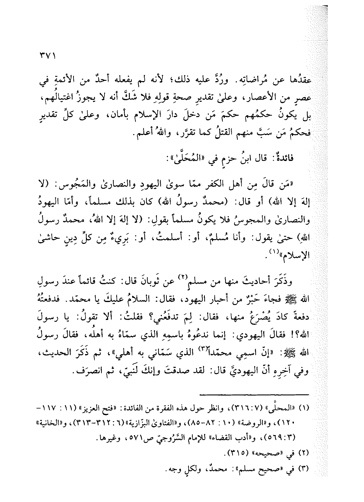 عقدها عن مراضاته. ورد عليه ذلك؛ لأنه لم يفعله أحد من الأئمة في عصر من الأعصار، وعلى تقدير صحة قوله فلا شك أنه لا يجوز اغتيالهم، بل يكون حكمهم حكم من دخل دار الإسلام بأمان، وعلى كل تقدير فحكم من سب منهم القتل كما تقرر، والله أعلم.