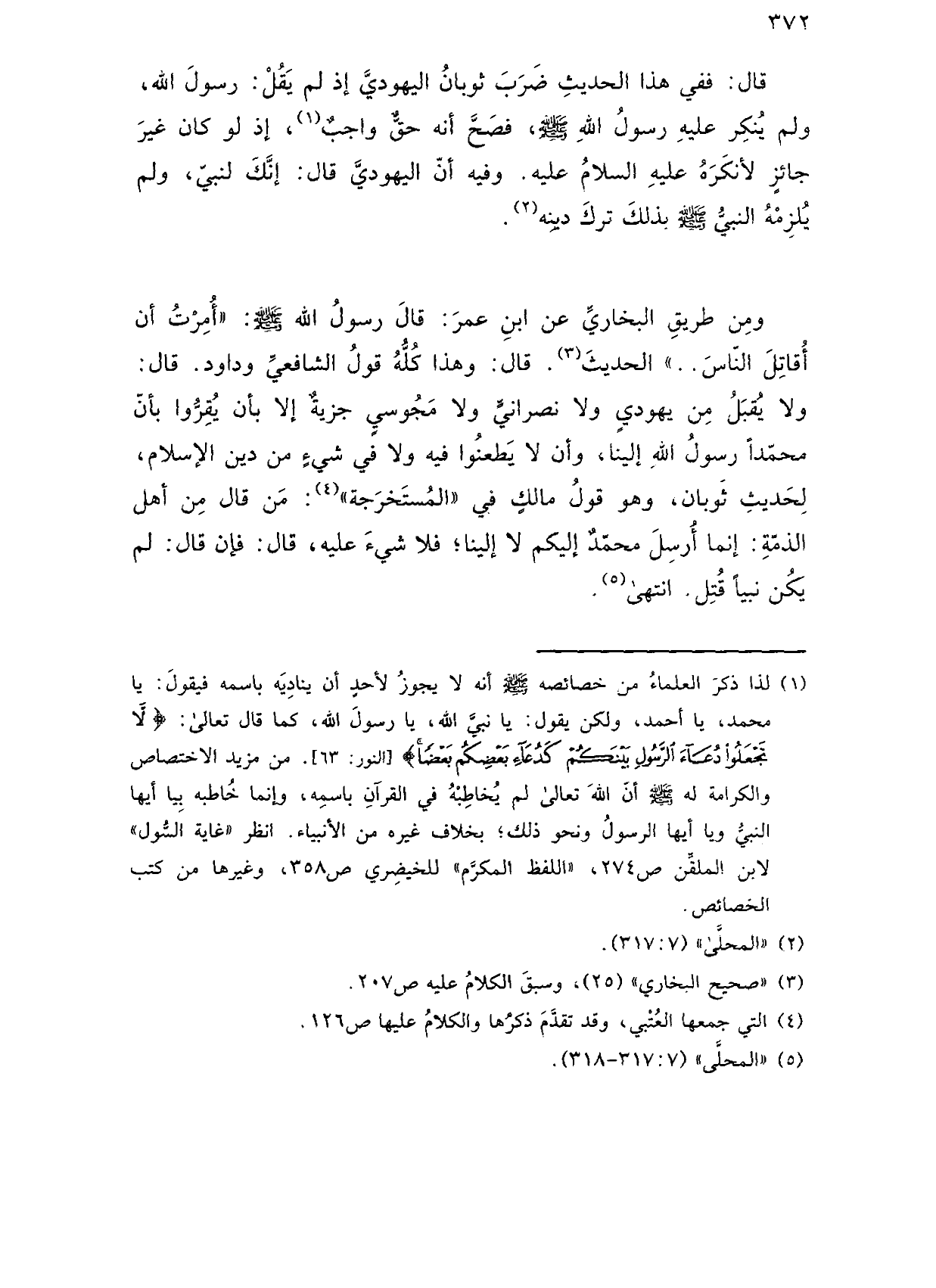 ومن طريق البخاري عن ابن عمر: قال رسول الله صلى الله عليه وسلم: "أمرت أن أقاتل الناس .. " الحديث. قال: وهذا كله قول الشافعي وداود. قال: ولا يقبل من يهودي ولا نصراني ولا مجوسي جزية إلا بأن يقروا بأن محمدًا رسول الله إلينا، وأن لا يطعنوا فيه ولا في شيء من دين الإسلام، لحديث ثوبان، وهو قول مالك في "المستخرجة": من قال من أهل الذمة: إنما أرسل محمد إليكم لا إلينا؛ فلا شيء عليه، قال: فإن قال: لم يكن نبيًا قتل. انتهى.
