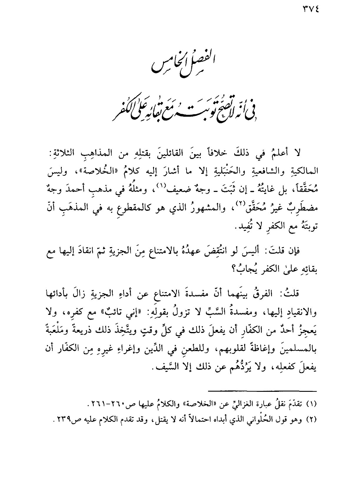 لا أعلم في ذلك خلافًا بين القائلين بقلته من المذاهب الثلاثة: المالكية والشافعية والحنبلية إلا ما أشار إليه كلام "الخلاصة"، وليس محققًا، بل غايته ـ إن ثبت ـ وجه ضعيف، ومثله في مذهب أحمد وجه مضطرب غير محقق، والمشهور الذي هو كالمقطوع به في المذهب أن توبته مع الكفر لا تفيد.