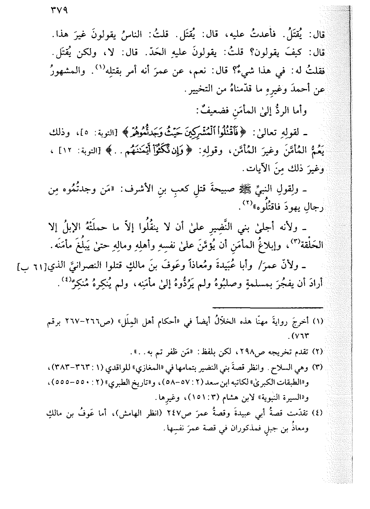 - ولأن عمر/ وأبا عبيدة ومعاذًا وعوف بن مالك قتلوا النصراني الذي أراد أن يفجر بمسلمة وصلبوه ولم يردوه إلى مأمنه، ولم ينكره منكر.