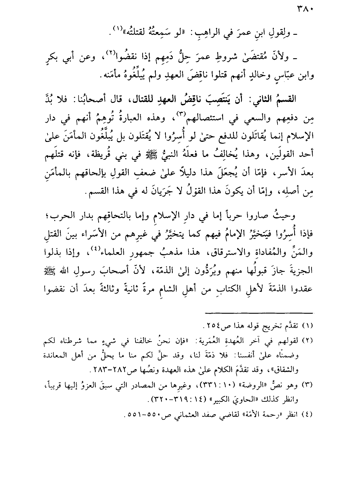 - ولأن مقتضى شروط عمر حل دمهم إذا نقضوا، وعن أبي بكر وابن عباس وخالد أنهم قتلوا ناقض العهد ولم يبلغوه مأمنه.
